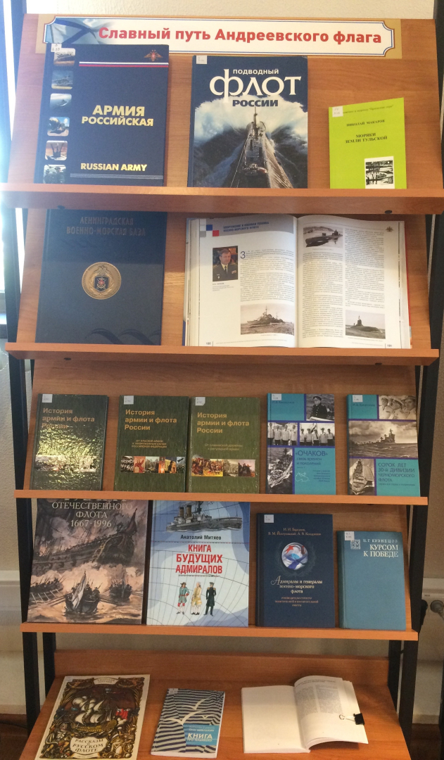 В читальном зале здания – шлема музея оружия представлена книжно-иллюстративная выставка «Славный путь Андреевского флага», посвящённая Дню Военно-морского флота.