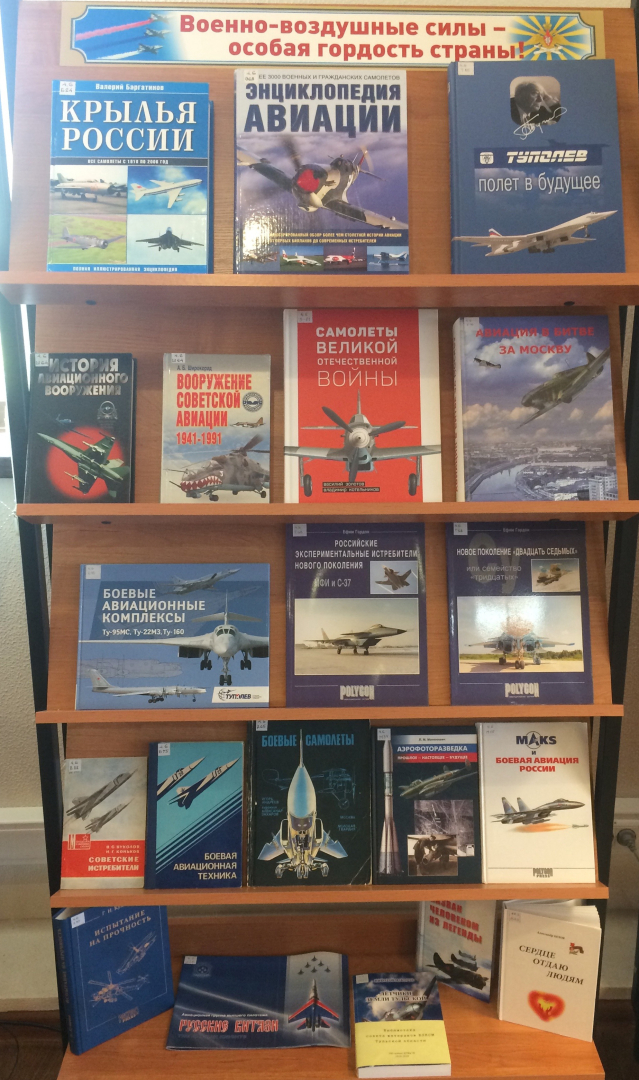 На выставке представлены издания по истории и современному состоянию Военно-воздушных сил, книги о боевых самолётах и их вооружении, о туляках - ветеранах ВВС.