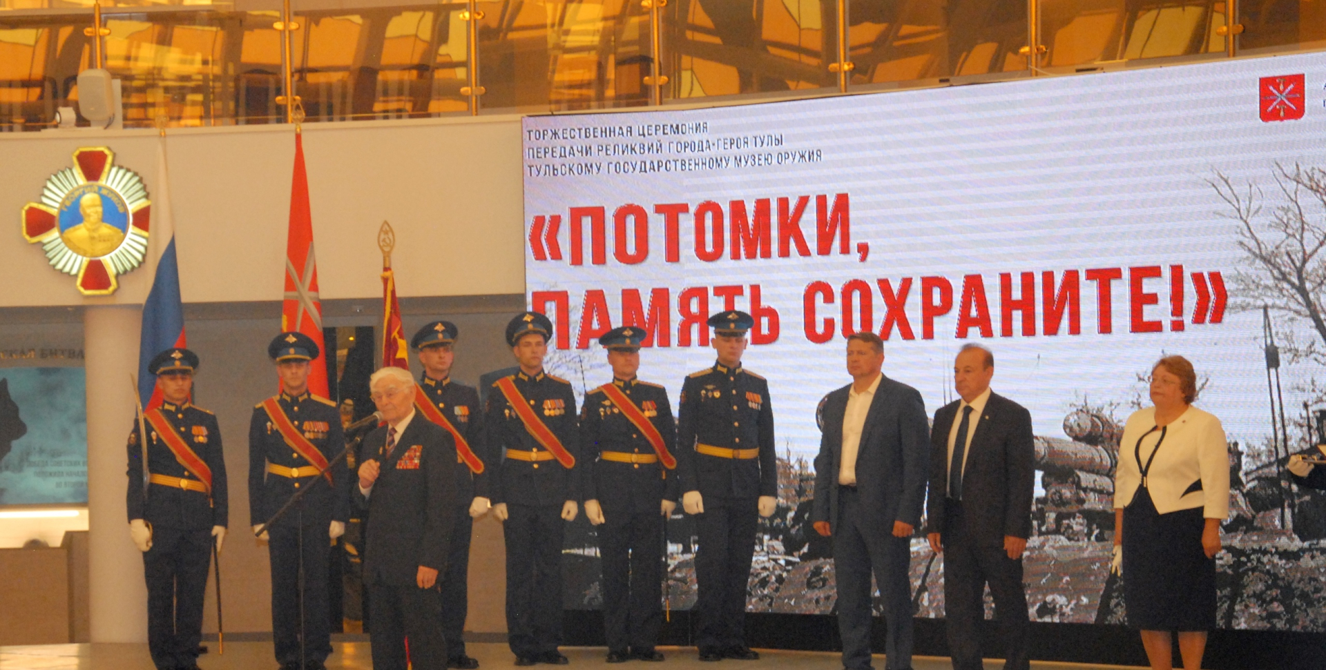 Глава города-героя Тулы Ю.И. Цкипури и глава администрации города Тулы Е.В. Авилов торжественно передали директору музея Н.И. Калугиной знамя города-героя Тулы, медаль «Золотая Звезда», орден Ленина и ценные документы.