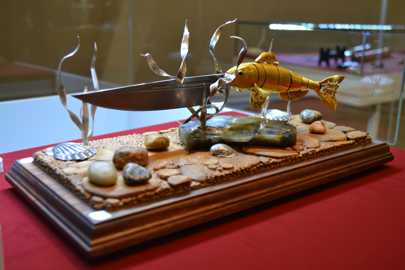 Роскошные ножи, кинжалы, стилеты, изготовленные и украшенные в разнообразных техниках обработки металла, камня, дерева и кости, а также великолепные аксессуары (ножны, подставки и футляры) удивят самого искушенного зрителя красотой и точностью исполнения.