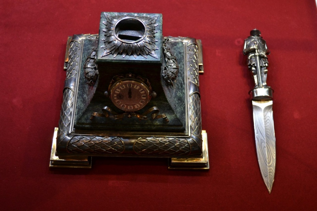 Подставка ножа - настоящее произведение искусства. Четырехугольная, в форме усеченной пирамиды, она выполнена из поделочного камня зеленого цвета под названием «змеевик». В основании расположена хромоникелевая рамка с ножками по углам. По периметру рамка богато украшена горизонтальными лавровыми венками. На дне, покрытом тканью черного цвета, ‒ конический выступ. Основания ножек сделаны из кожи черного цвета. На передней стороне подставки размещены часы с круглым циферблатом, который сверху и снизу обрамляют ленты из хромоникелевого сплава. В центре лент ‒ гнездо с ограненным камнем. На боковых сторонах имеется декор из хромоникелевых лавровых гирлянд с лентами. На тыльной стороне мастер добавил медальон из того же материала в виде оружейной атрибутики, а снизу расположил ленту. На верхней образующей подставки ‒ цилиндрический хромоникелевый выступ с круглым углублением и прямоугольным отверстием в обрамлении ниспадающих лавровых листьев.