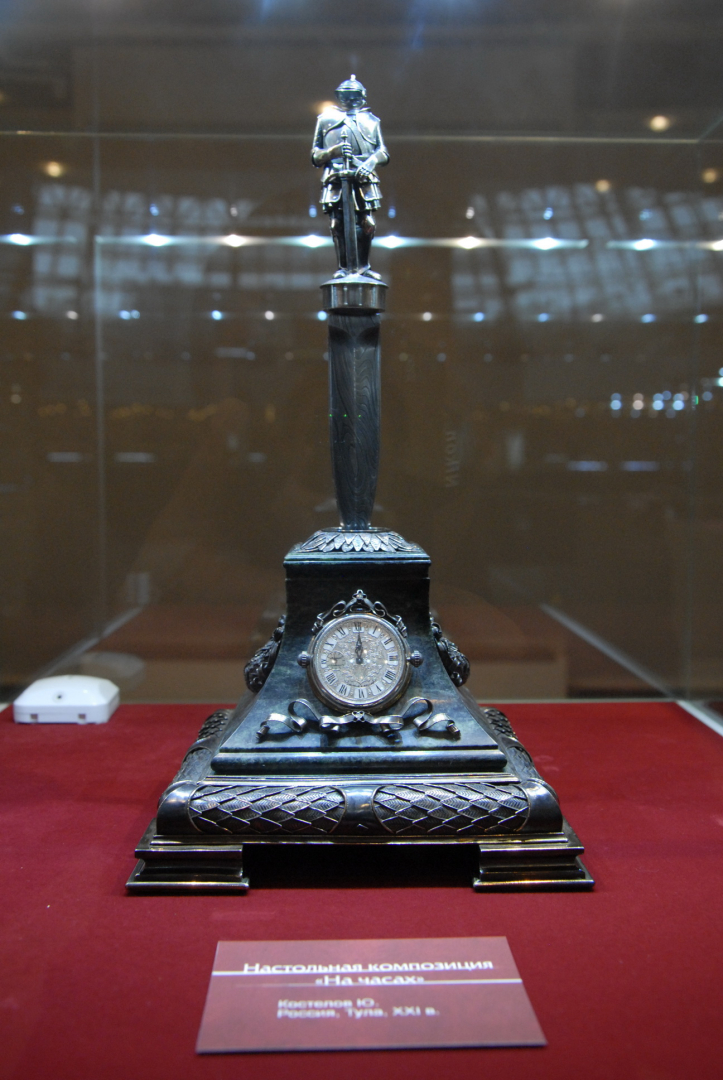 Изысканные настольные композиции тульских мастеров продолжают радовать посетителей на выставке «Авторское холодное оружие». Некоторые из них выполняют не только эстетические функции, а имеют вполне утилитарное назначение. К примеру, замечательная настольная композиция Ю.Б. Костелова «На часах». Она состоит из ножа и подставки. Двухлезвийный клинок выполнен из дамасской стали, а рукоять в виде фигуры рыцаря, стоящего в полных доспехах и вооруженного двуручным мечом, ‒ из хромоникелевого сплава. У ног рыцаря (сзади) выбито клеймо: «К,О», XXI в. Россия, г. Тула.