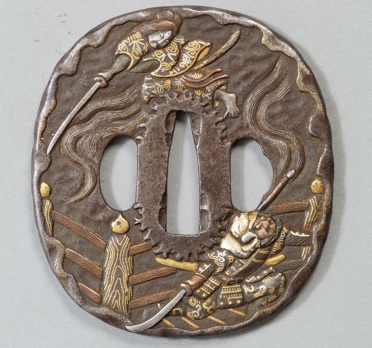На выставке представлена железная круглая «цуба», с двумя одинаковыми отверстиями хицу-ана. На лицевой стороне изображено дерево и два сражающихся на палках тануки: один находится высоко в прыжке, другой стоит внизу. С обратной стороны – рельефное изображение фрагментов ствола дерева.