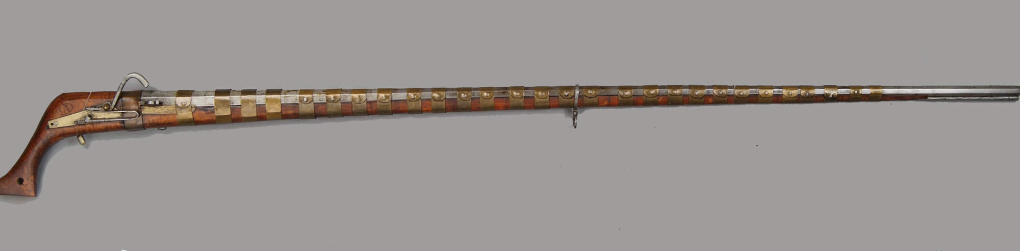 Китайское фитильное ружье имеет длинный восьмигранный кованый ствол с гладким каналом, прикрепленным к ложе с помощью двадцати девяти плоских латунных колец. Интересная особенность модели – необычный приклад, выполненный в форме рукояти пистолетного типа. Она очень короткая и не пропорциональна по отношению к стволу. Боевая пружина фитильного замка находится снаружи.