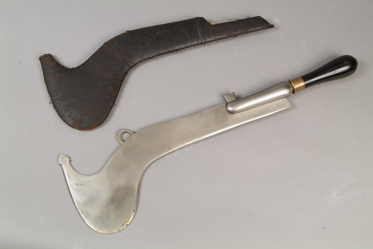 Холодное оружие, которое использовалось народами Афганистана, было, в основном, индийского и иранского типов. Нож хайбер, представленный на выставке, считается типично афганским оружием. У него тяжелый, расширяющийся к рукояти прямой клинок Т-образного сечения, изготовленный из булатной стали. Длина ножа – 60 см, что, по мнению некоторых исследователей, позволяет отнести его к тесакам. Рукоять состоит из двух щечек из рога, имеющих поперечные выемки для более прочного захвата. Хайбер носился чаще всего заткнутым за пояс.