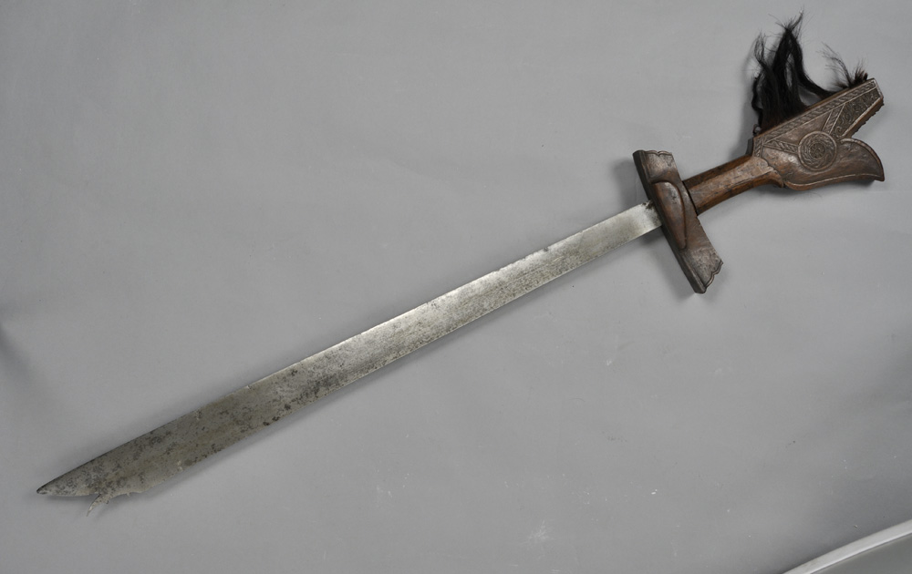 Интересная деталь ножен – две массивные обоймицы выполнены в том же стиле, что и детали рукояти. При помощи обоймиц меч крепился на поясе воина горизонтально лезвием вниз.