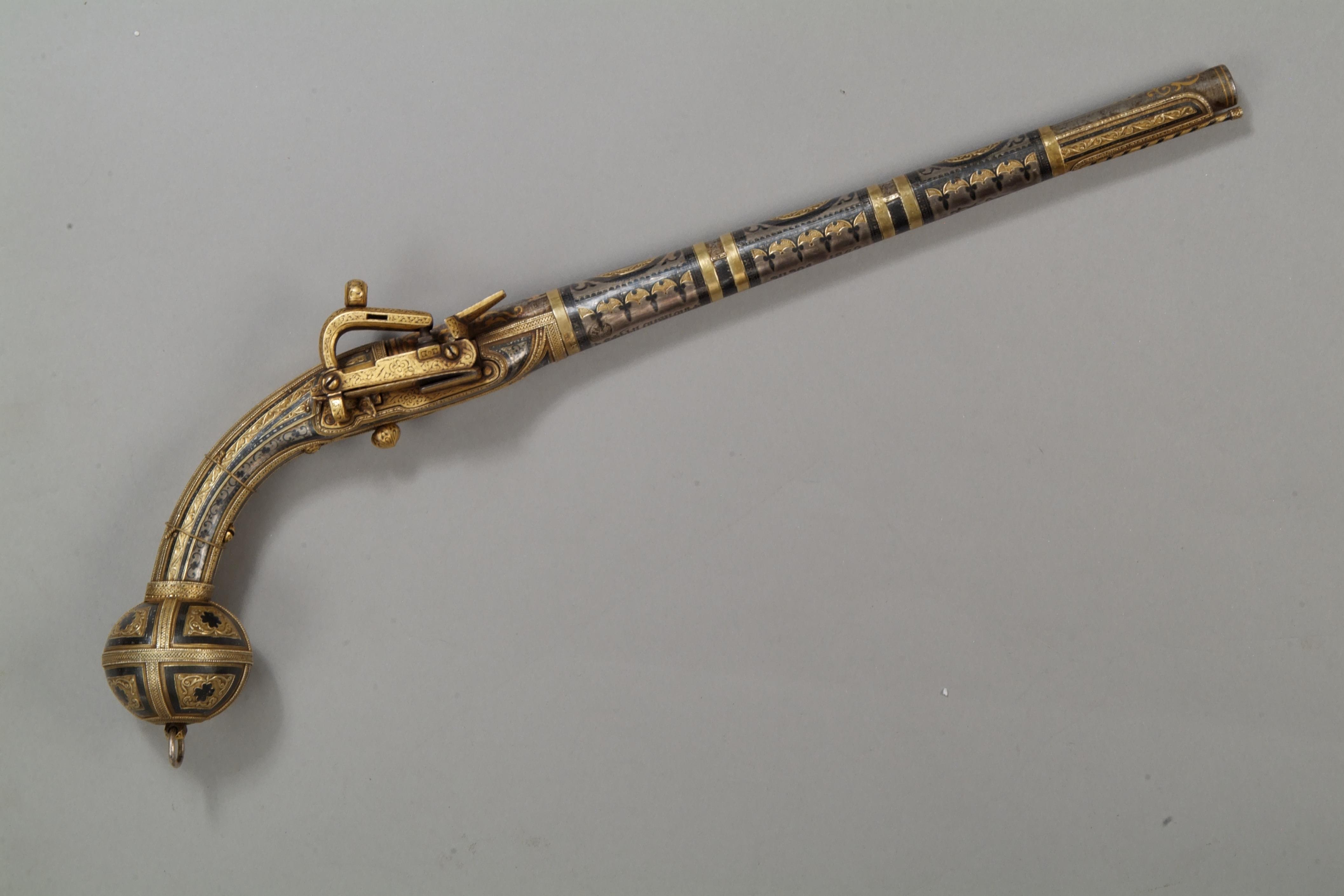 Интересно, что капсюльный замок пистолета, сплошь покрытый золотой насечкой, имитирует по форме кремневый замок кавказского типа.