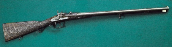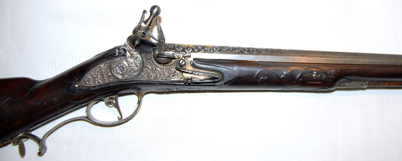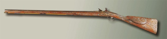 Образец привлекает внимание своей художественной отделкой. Его шомпольные трубочки и фигурная спусковая скоба выполнены из серебра. Серебряная прорезная накладка под замочные винты воспроизводит тритона и фантастическую рыбу в обрамлении растительного орнамента. Такой же рельефный растительный орнамент отчеканен на стволе, замке, спусковом крючке, спусковой скобе и шомпольных трубочках.
