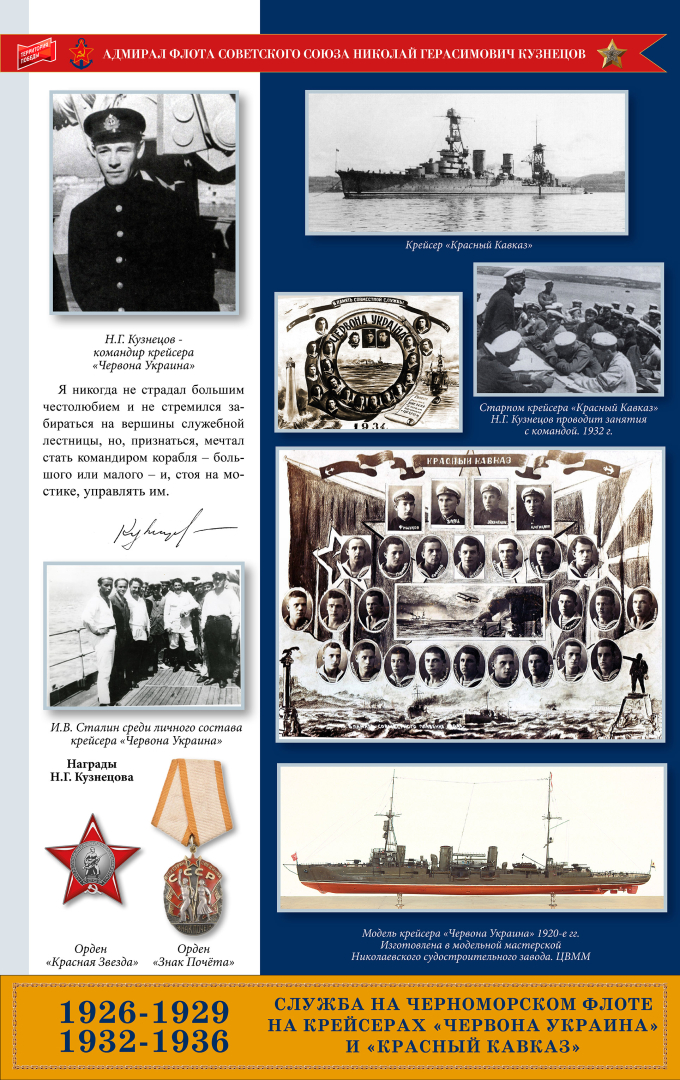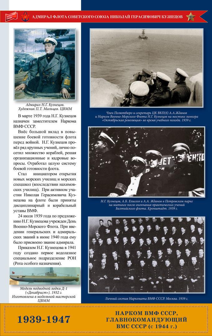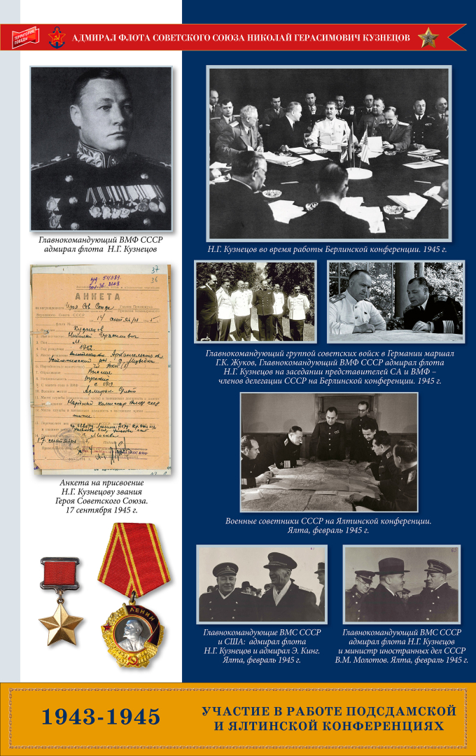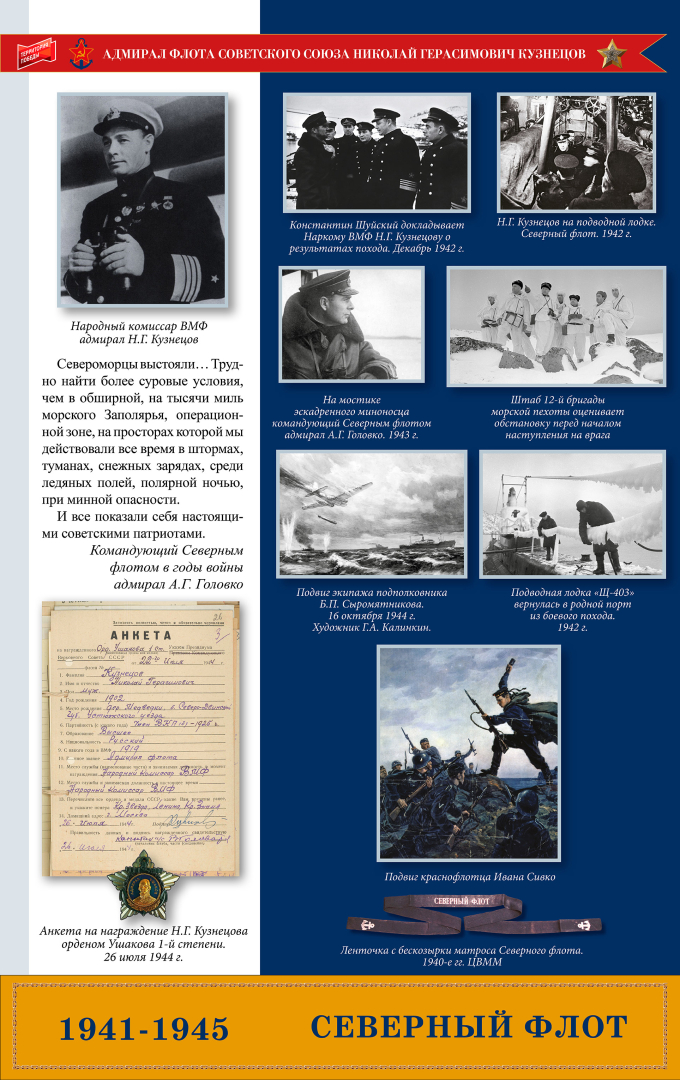 Материалы выставки раскрывают яркие страницы жизни и службы Наркома ВМФ, Главнокомандующего Военно-морским флотом, адмирала флота Советского Союза Николая Герасимовича Кузнецова, его вклад в становление и развитие Военно-морского флота в предвоенный период, участие в Великой Отечественной войне, в Крымской и Потсдамской конференциях и других исторических событиях.
