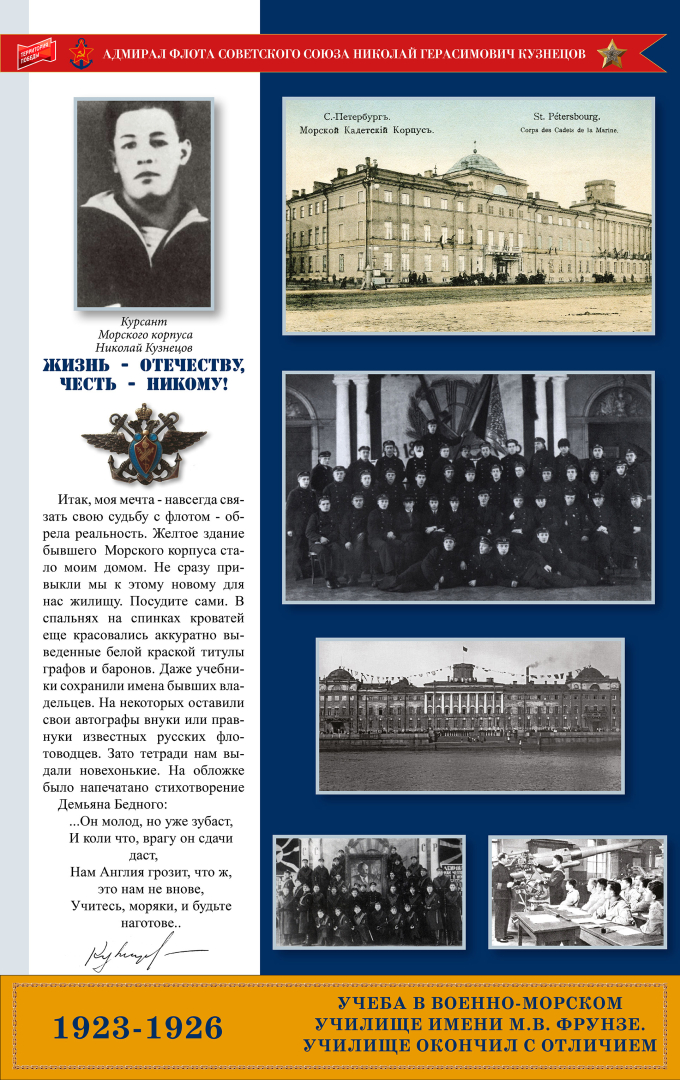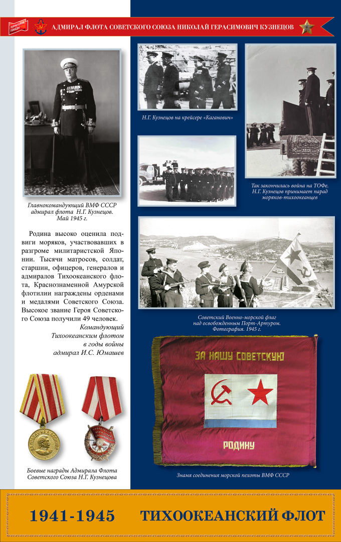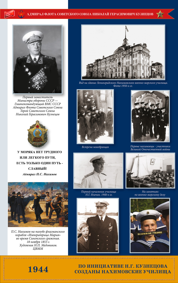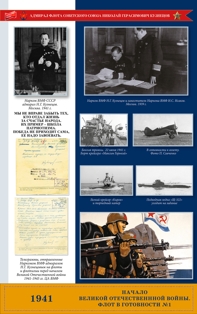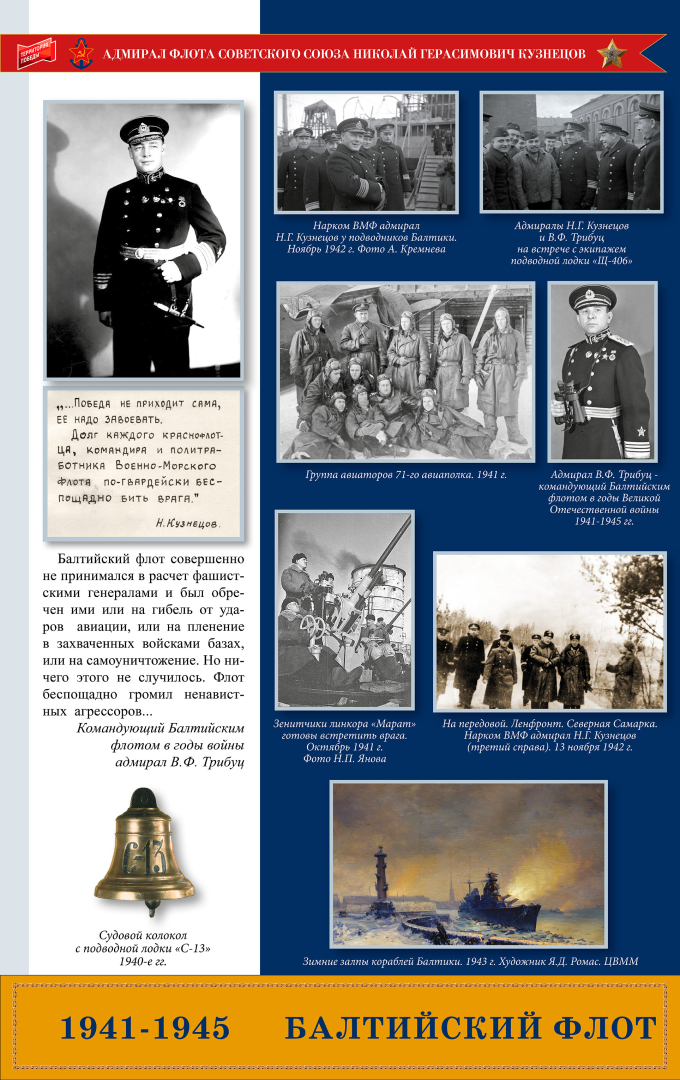 Материалы выставки раскрывают яркие страницы жизни и службы Наркома ВМФ, Главнокомандующего Военно-морским флотом, адмирала флота Советского Союза Николая Герасимовича Кузнецова, его вклад в становление и развитие Военно-морского флота в предвоенный период, участие в Великой Отечественной войне, в Крымской и Потсдамской конференциях и других исторических событиях.