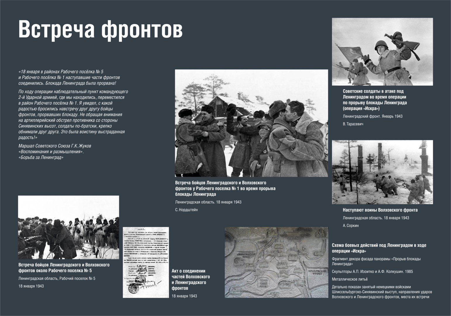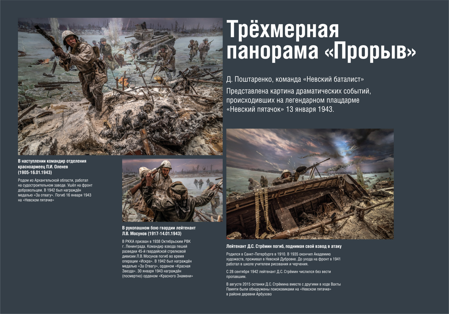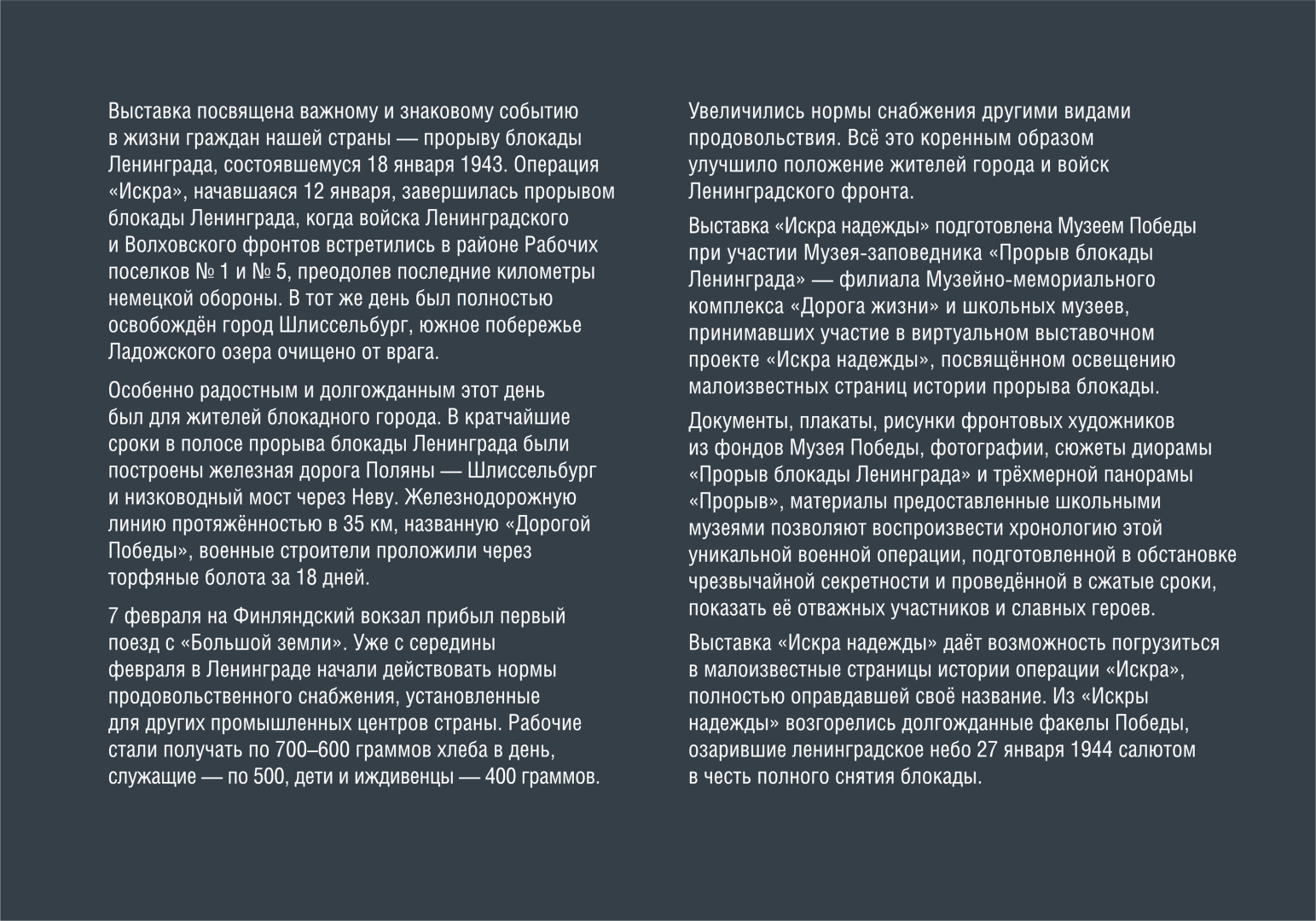 Проект создан Музеем Победы в содружестве с Музеем-заповедником «Прорыв блокады Ленинграда» – филиалом Государственного бюджетного учреждения культуры Ленинградской области «Дорога жизни».
