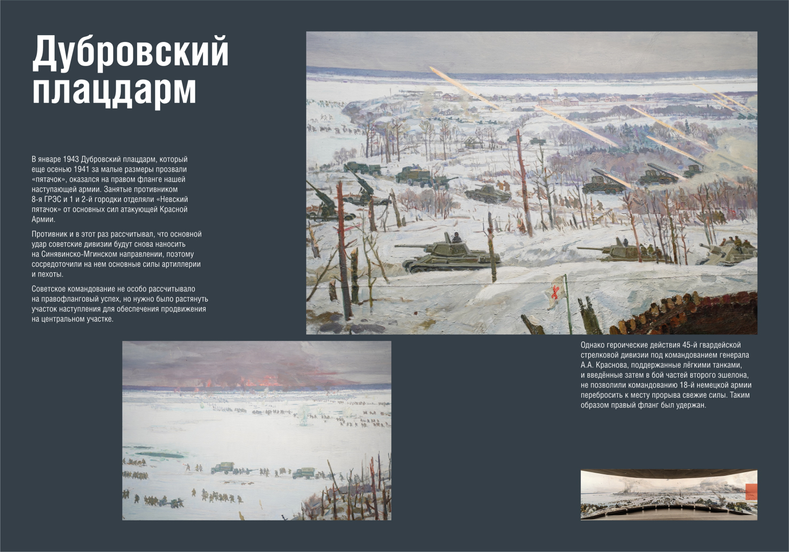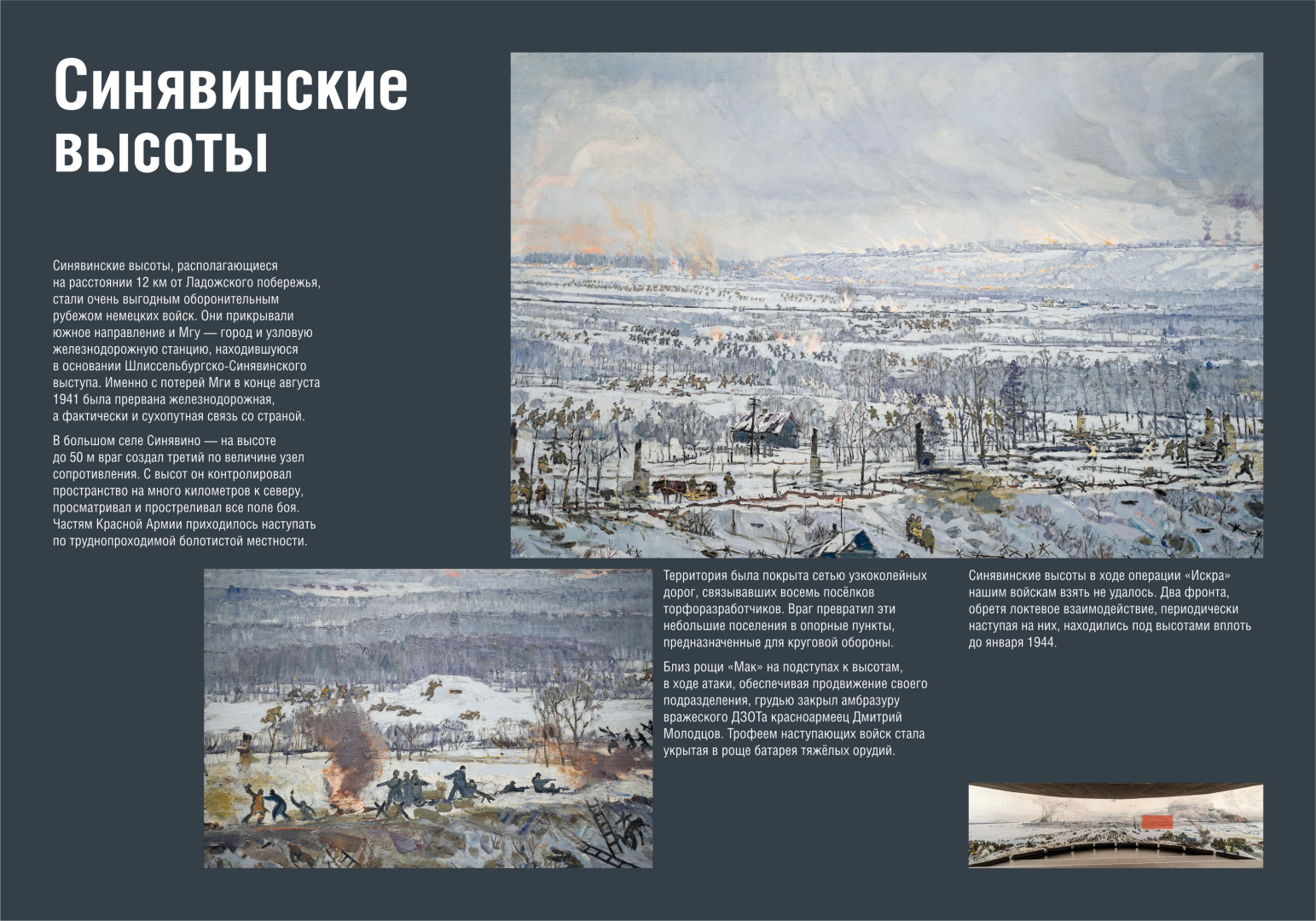 Вниманию посетителей представлены рисунки фронтовых художников, документы, плакаты и фотографии военных лет. Выставка воспроизводит хронологию подготовки и проведения уникальной боевой операции по прорыву блокады Ленинграда, раскрывает подвиги героев тех драматических событий.