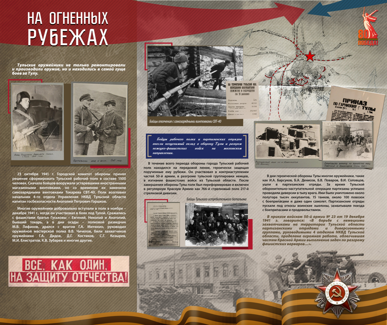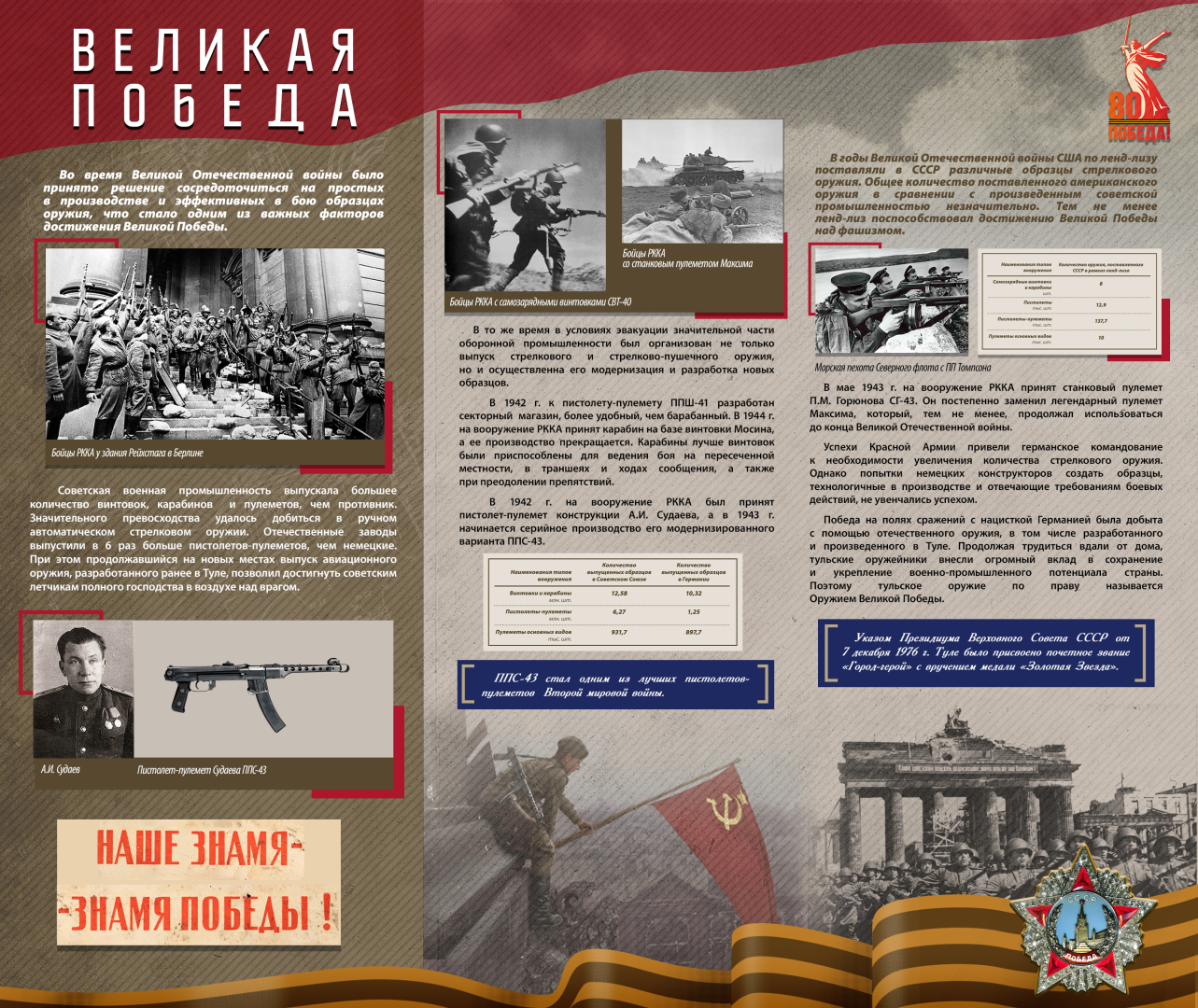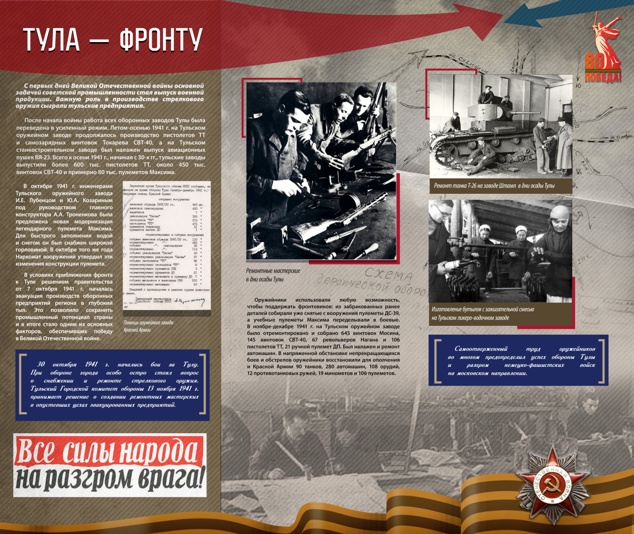 Проект отражает огромную роль отечественных, прежде всего тульских, оборонных предприятий в разработке и производстве оружия Великой Победы. Готовность к самопожертвованию, героический энтузиазм, смелость идей и поступков, упорство в достижении целей – это те характерные черты фронтовиков и тружеников тыла, которые нашли свое яркое воплощение в отечественном оружии и, в конечном итоге, позволили одержать Великую Победу.