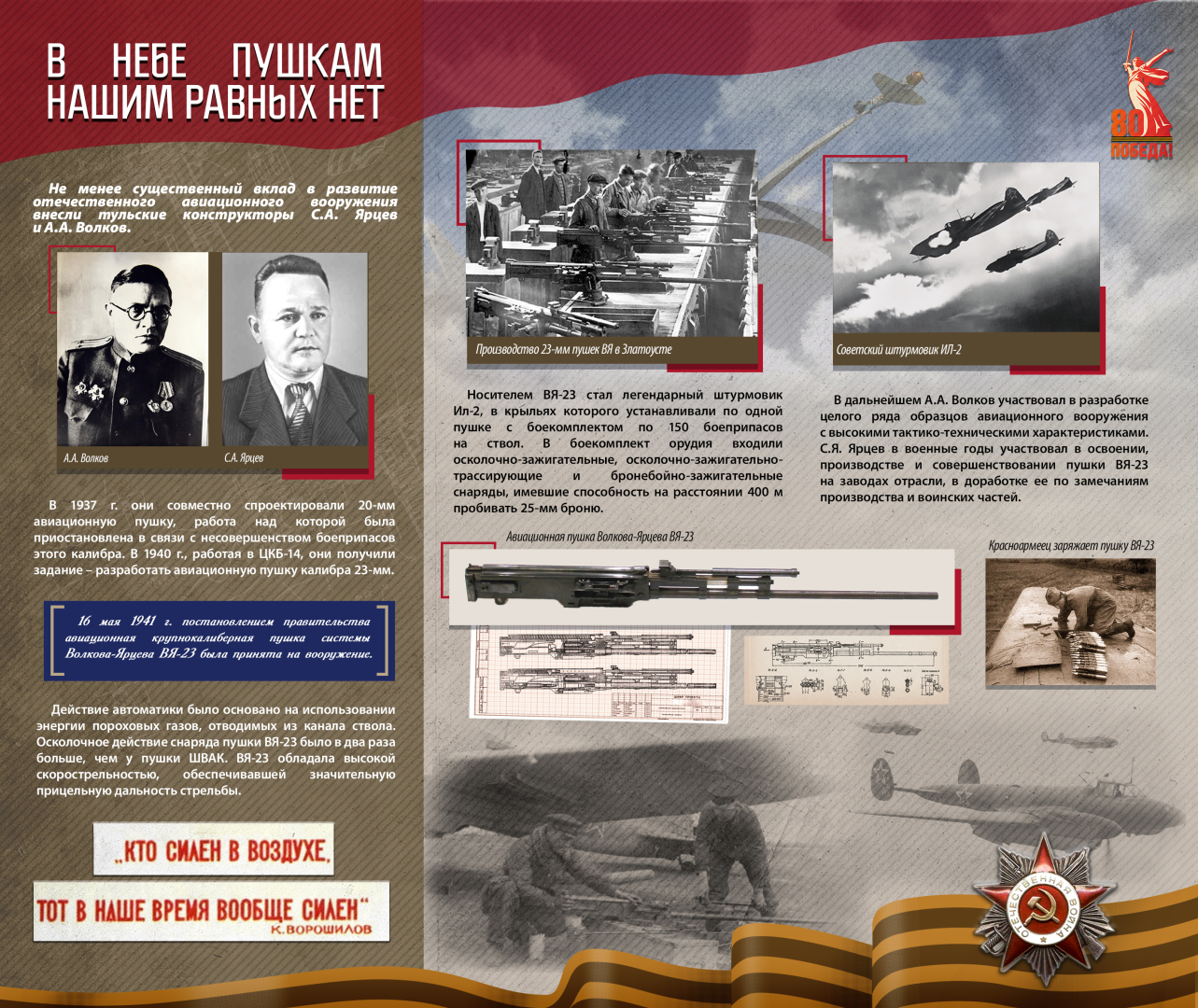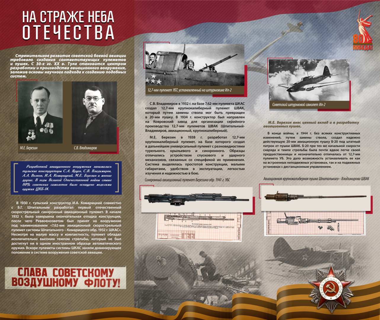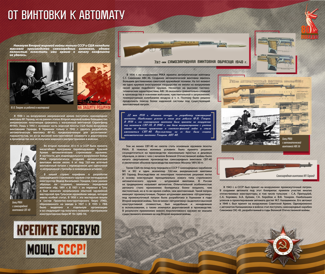 Проект отражает огромную роль отечественных, прежде всего тульских, оборонных предприятий в разработке и производстве оружия Великой Победы. Готовность к самопожертвованию, героический энтузиазм, смелость идей и поступков, упорство в достижении целей – это те характерные черты фронтовиков и тружеников тыла, которые нашли свое яркое воплощение в отечественном оружии и, в конечном итоге, позволили одержать Великую Победу.