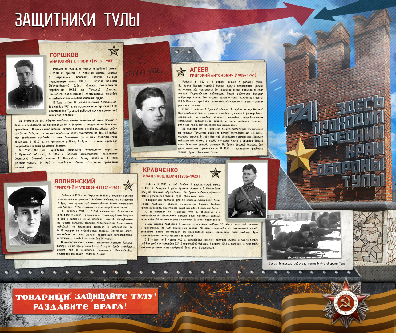 В оформлении проекта представлены портреты тульских оружейников-конструкторов, схемы и редкие фотографии образцов оружия, созданных ими и получивших широкое применение в РККА и на советской боевой технике в годы Великой Отечественной войны, а также иллюстративный материал, посвященный героической обороне г. Тулы от войск фашистской Германии осенью – зимой 1941 г.