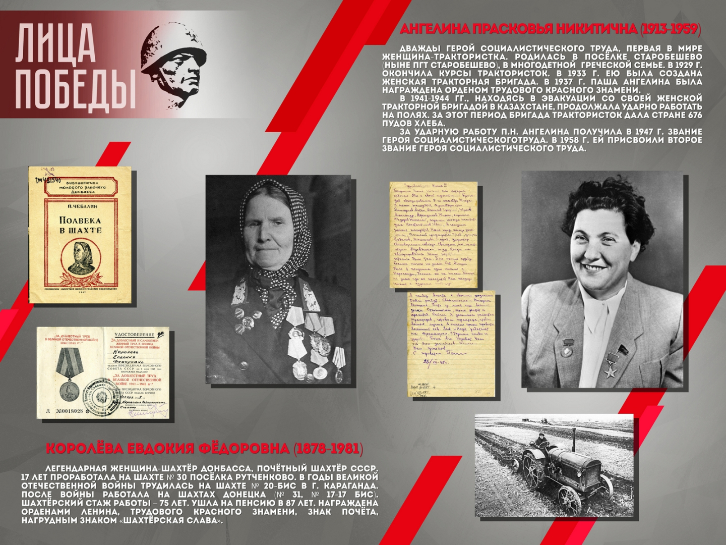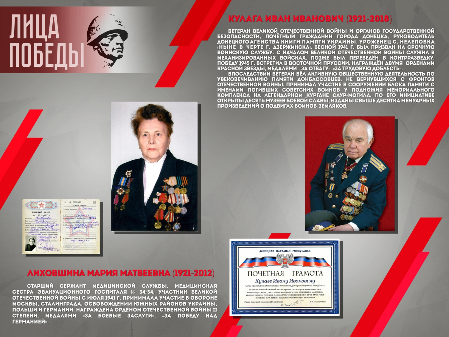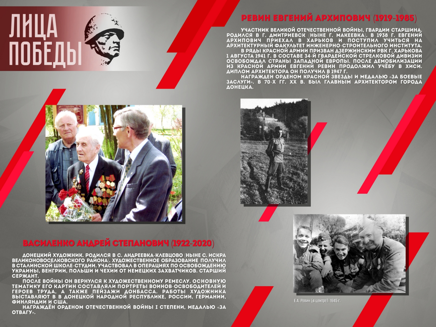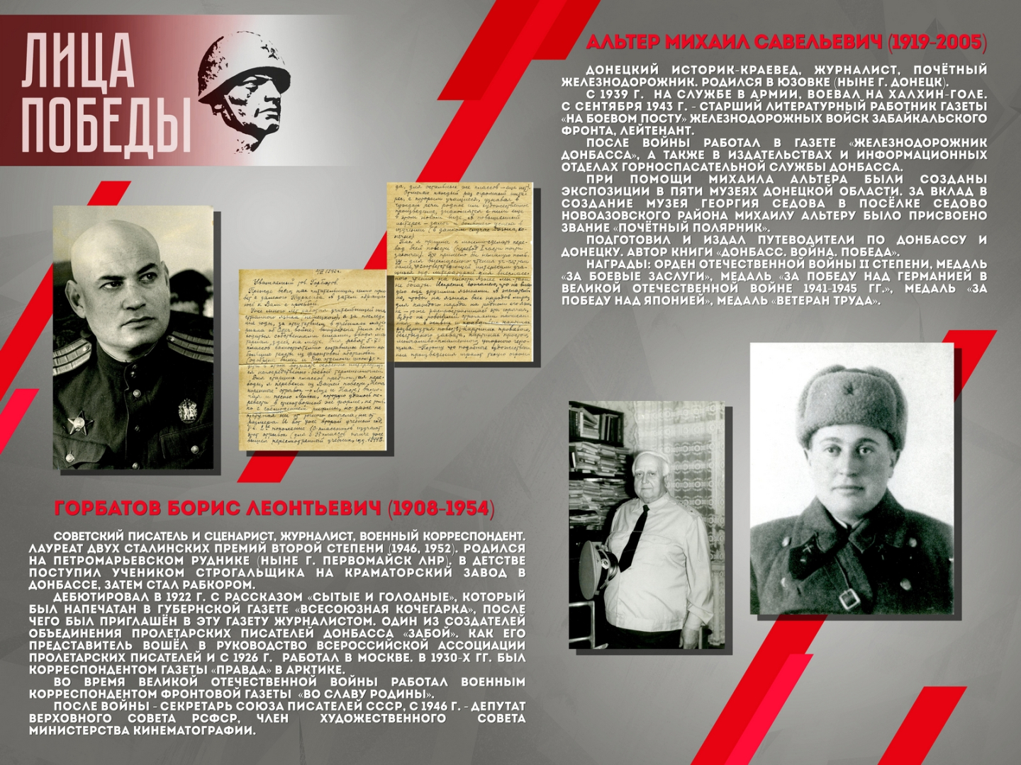 Проект повествует о шестнадцати жителях Донбасса – участниках Великой Отечественной войны, среди которых Герой Советского Союза Александров Н.А., Герой Социалистического труда Ангелина П.Н. и военный корреспондент Горбатов Б.Л. Выставка создана на основе исторических документов и фотоматериалов из фондов Донецкого республиканского краеведческого музея.