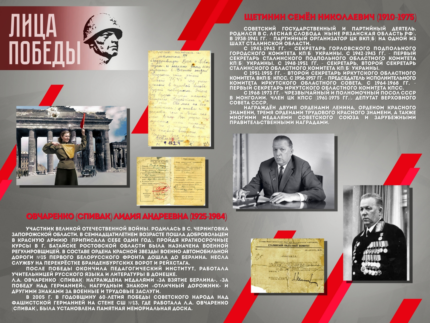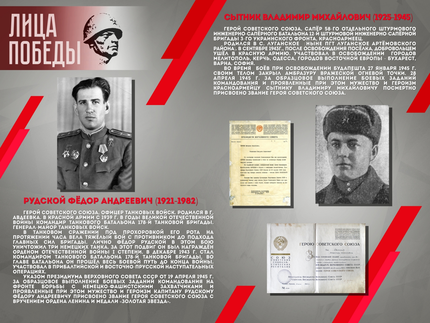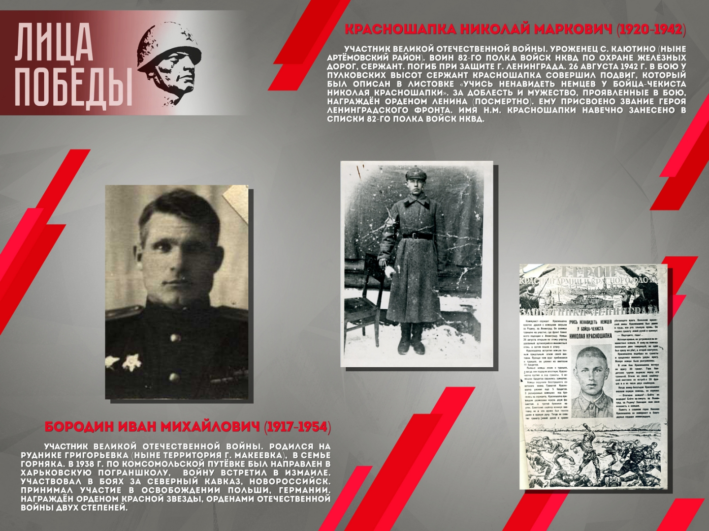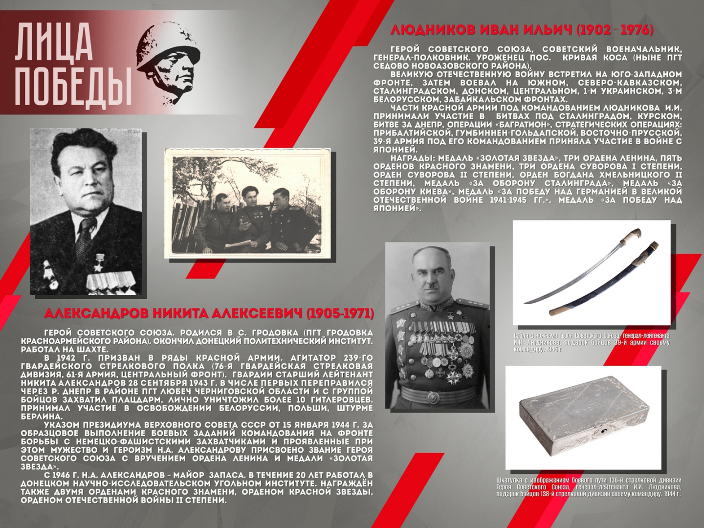 Проект повествует о шестнадцати жителях Донбасса – участниках Великой Отечественной войны, среди которых Герой Советского Союза Александров Н.А., Герой Социалистического труда Ангелина П.Н. и военный корреспондент Горбатов Б.Л. Выставка создана на основе исторических документов и фотоматериалов из фондов Донецкого республиканского краеведческого музея.