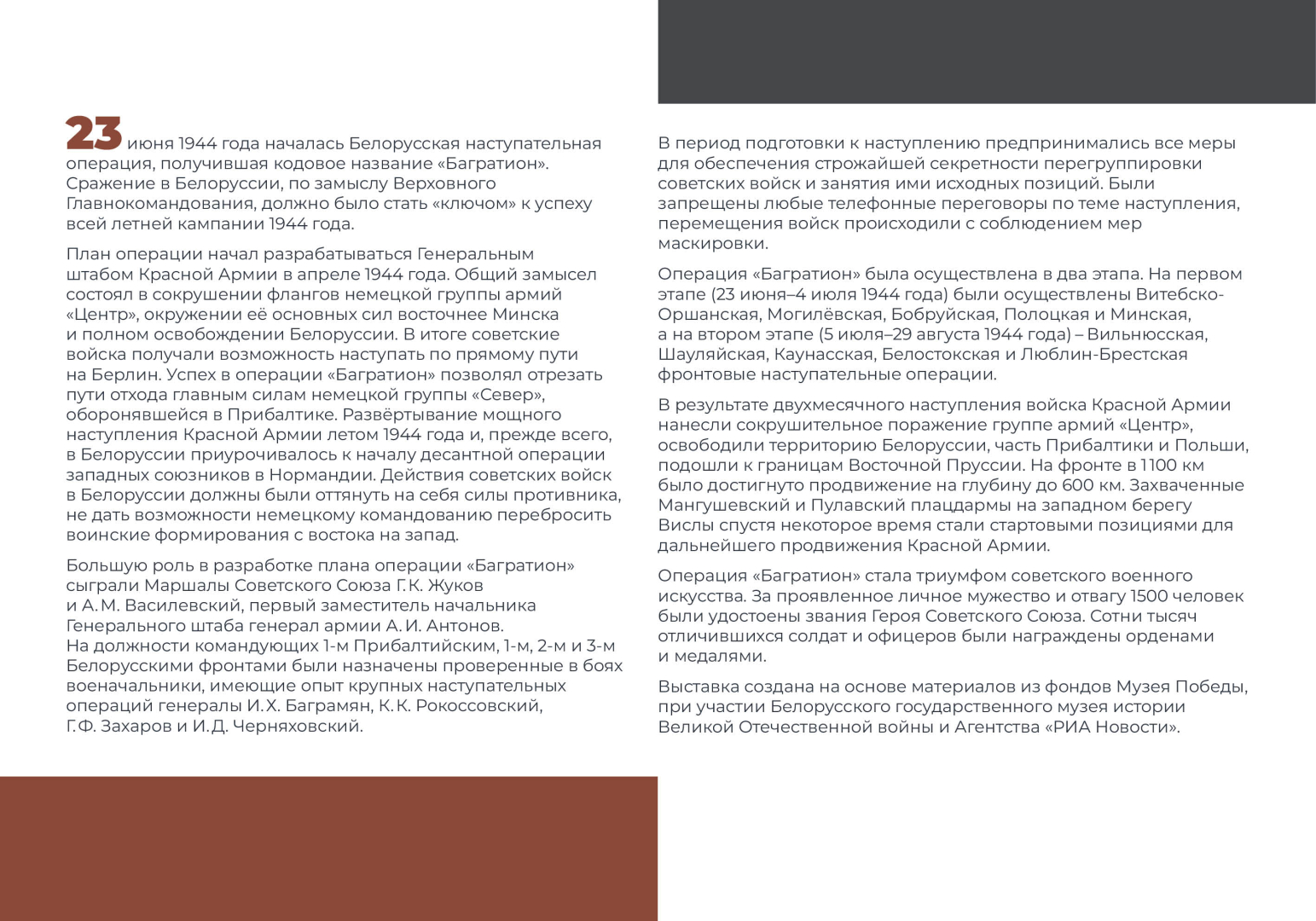 Проект посвящен 80-летию освобождения Белоруссии от немецко-фашистских оккупантов в ходе стратегической наступательной операции советского командования под кодовым названием «Багратион», которая проводилась с 23 июня по 29 августа 1944 года.