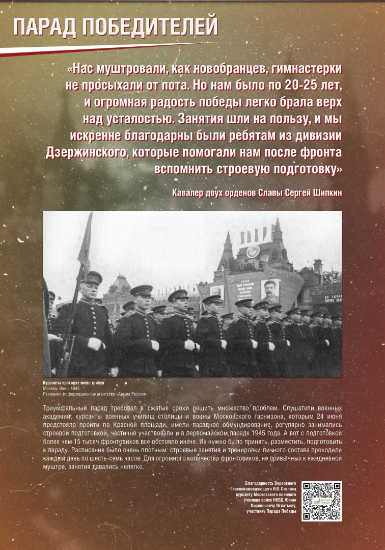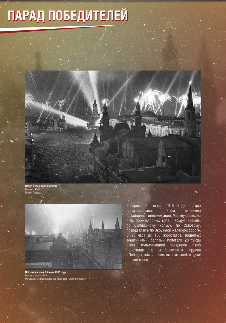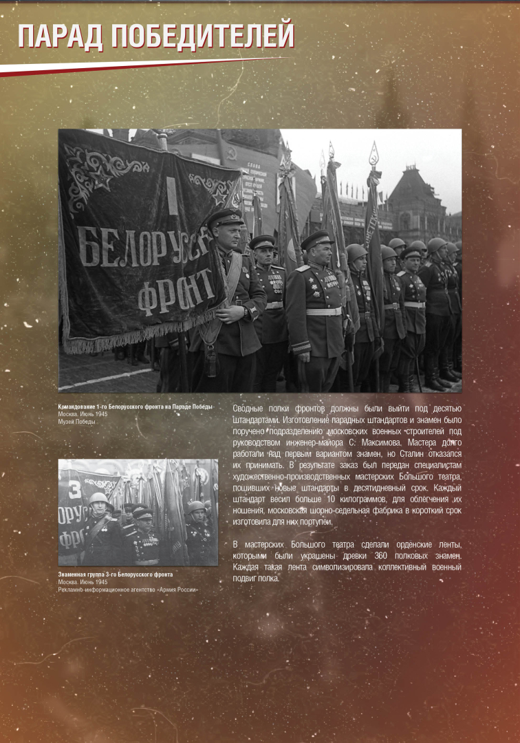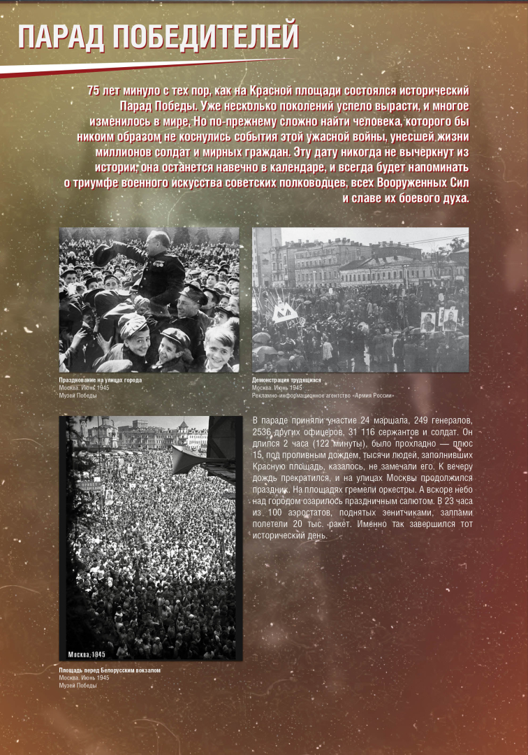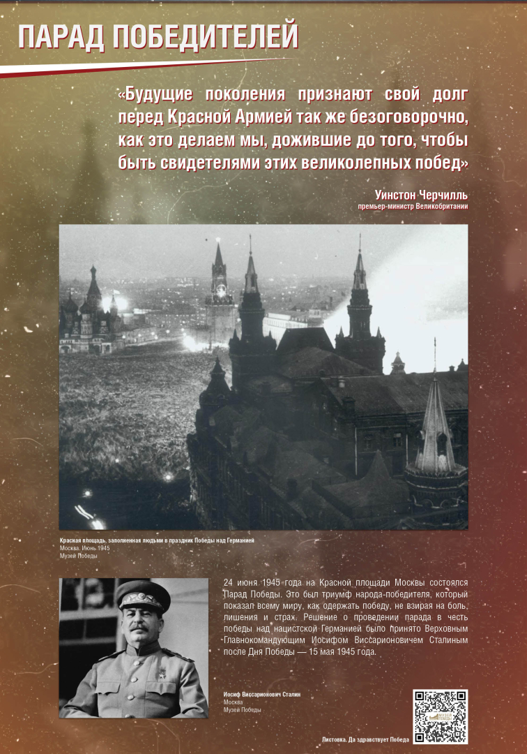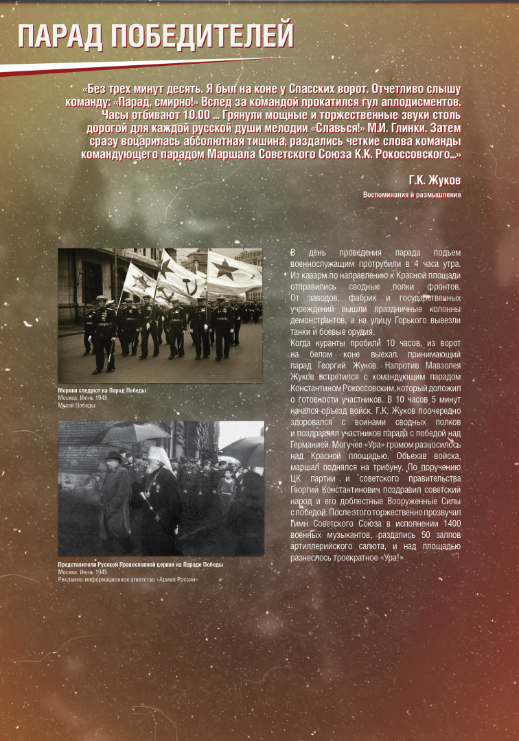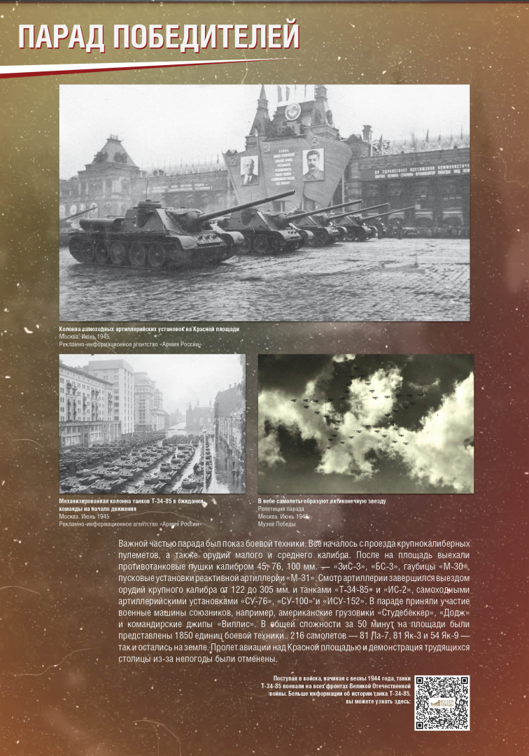 Выставка раскрывает историю Парада Победы на Красной Площади в Москве 24 июня 1945 года, в проведении которого участвовало до 40 тысяч военнослужащих и 1850 единиц боевой техники. Это историческое событие продемонстрировало героический дух и нравственную силу народа-победителя.