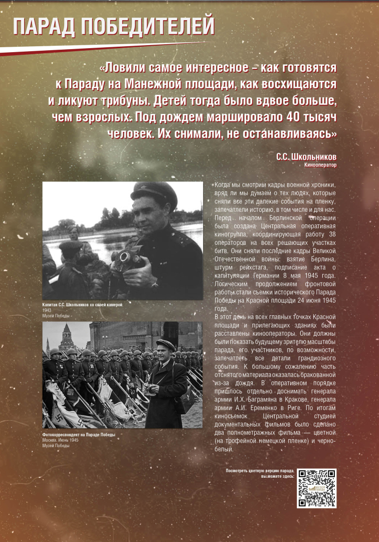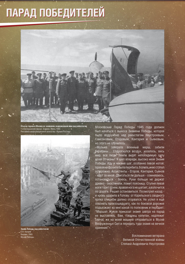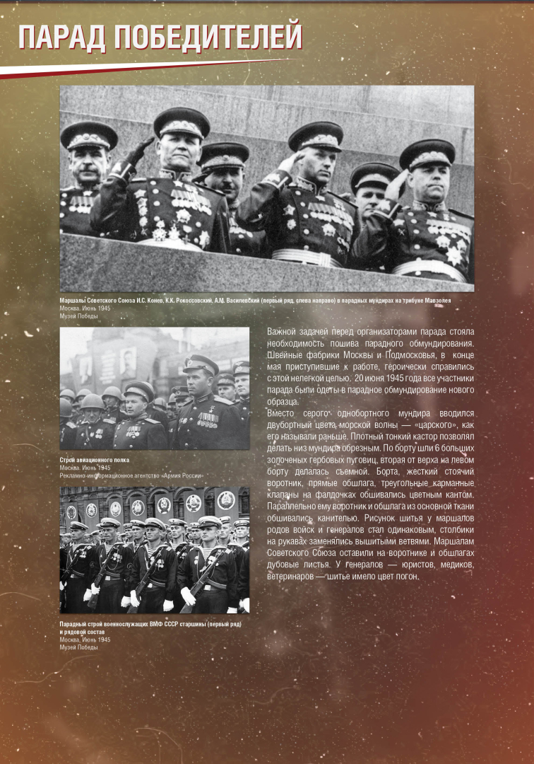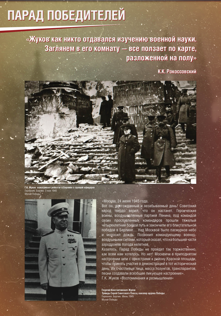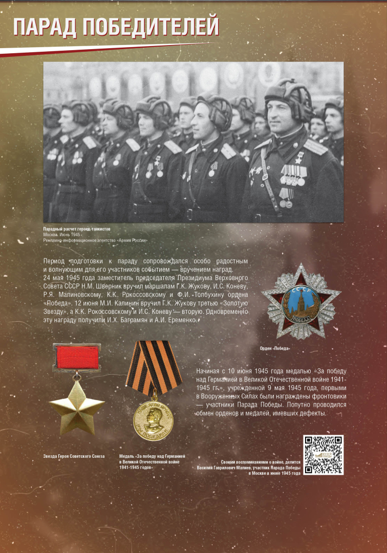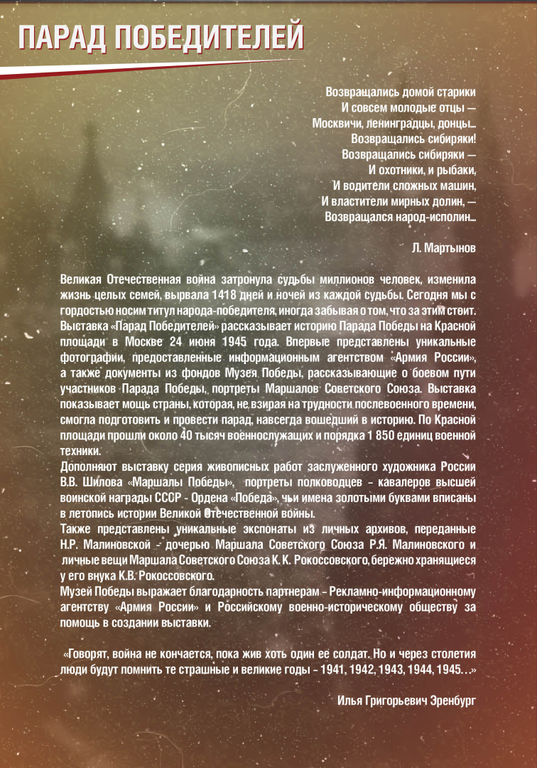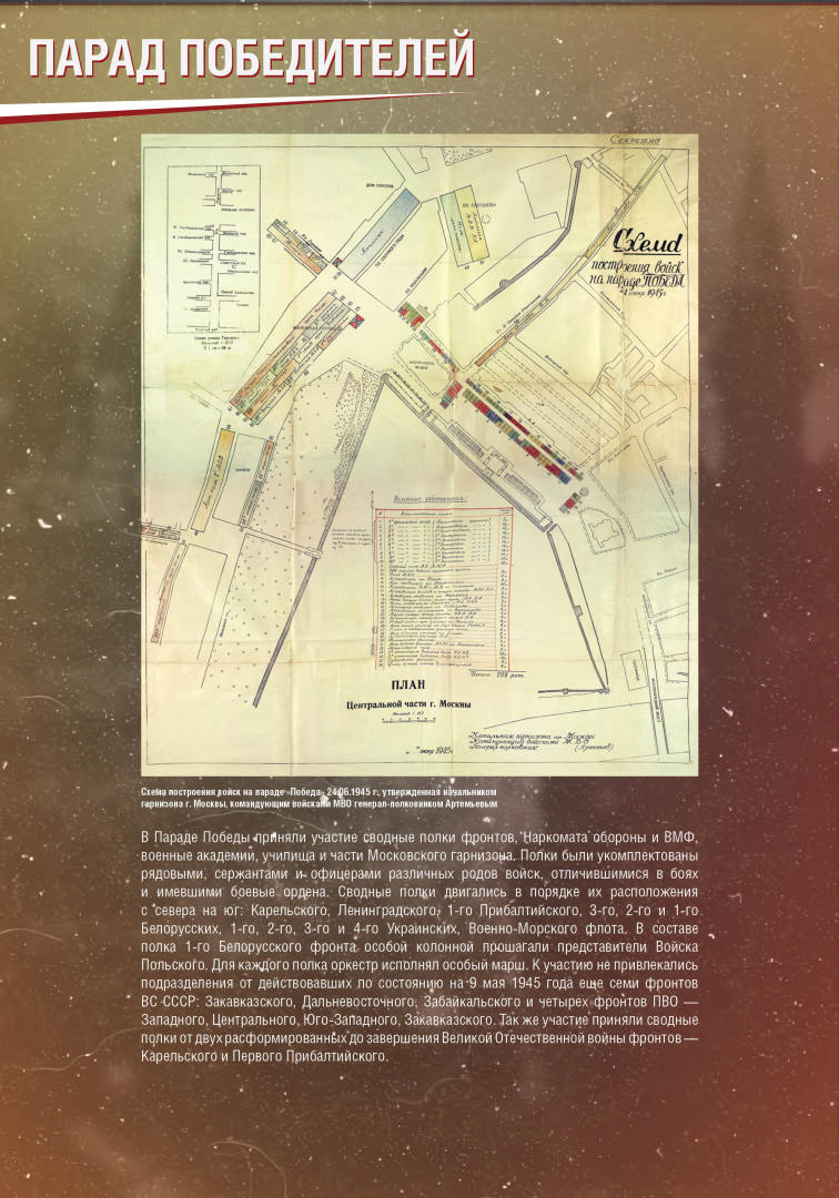 Выставка раскрывает историю Парада Победы на Красной Площади в Москве 24 июня 1945 года, в проведении которого участвовало до 40 тысяч военнослужащих и 1850 единиц боевой техники. Это историческое событие продемонстрировало героический дух и нравственную силу народа-победителя.