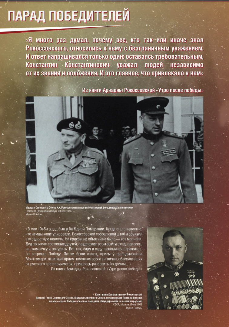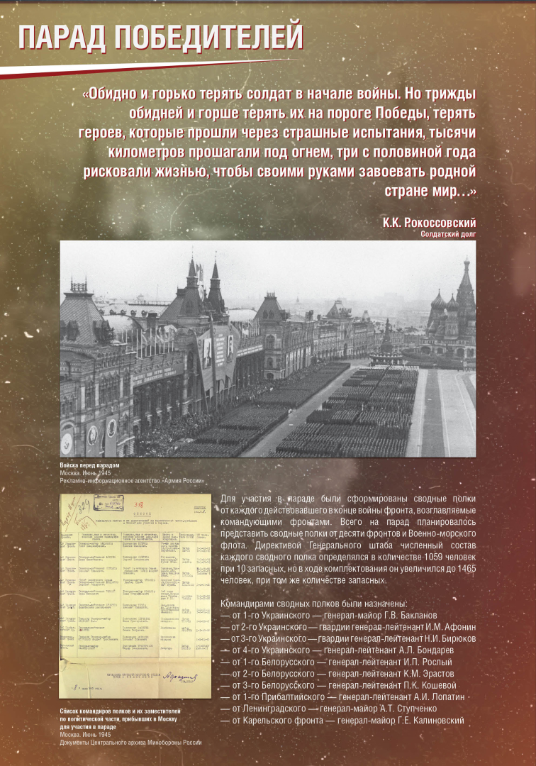 Вниманию посетителей выставки впервые представлены уникальные фотографии информационного агентства «Армия России», документы о боевом пути участников парада из фондов Музея Победы, реликвии из семейных архивов маршалов Р.Я. Малиновского и К.К. Рокоссовского.