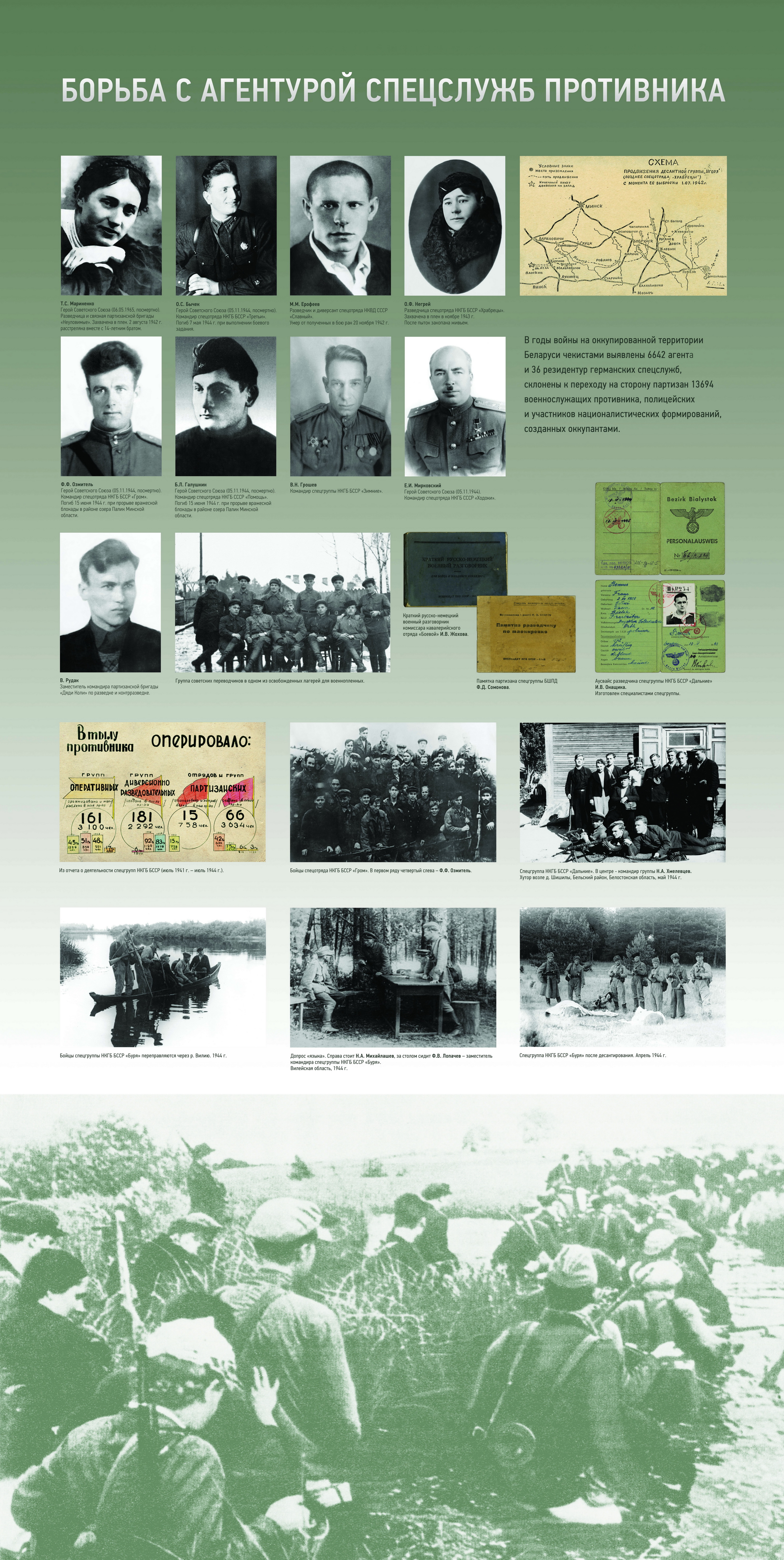 В годы Великой Отечественной войны белорусские сотрудники госбезопасности выявили свыше 6 500 агентов противника, завербовали до 14 000 вражеских военных и их пособников, уничтожили в боях до 73 000 немецких солдат и офицеров, провели сотни диверсий против инфраструктуры и боевой техники врага.