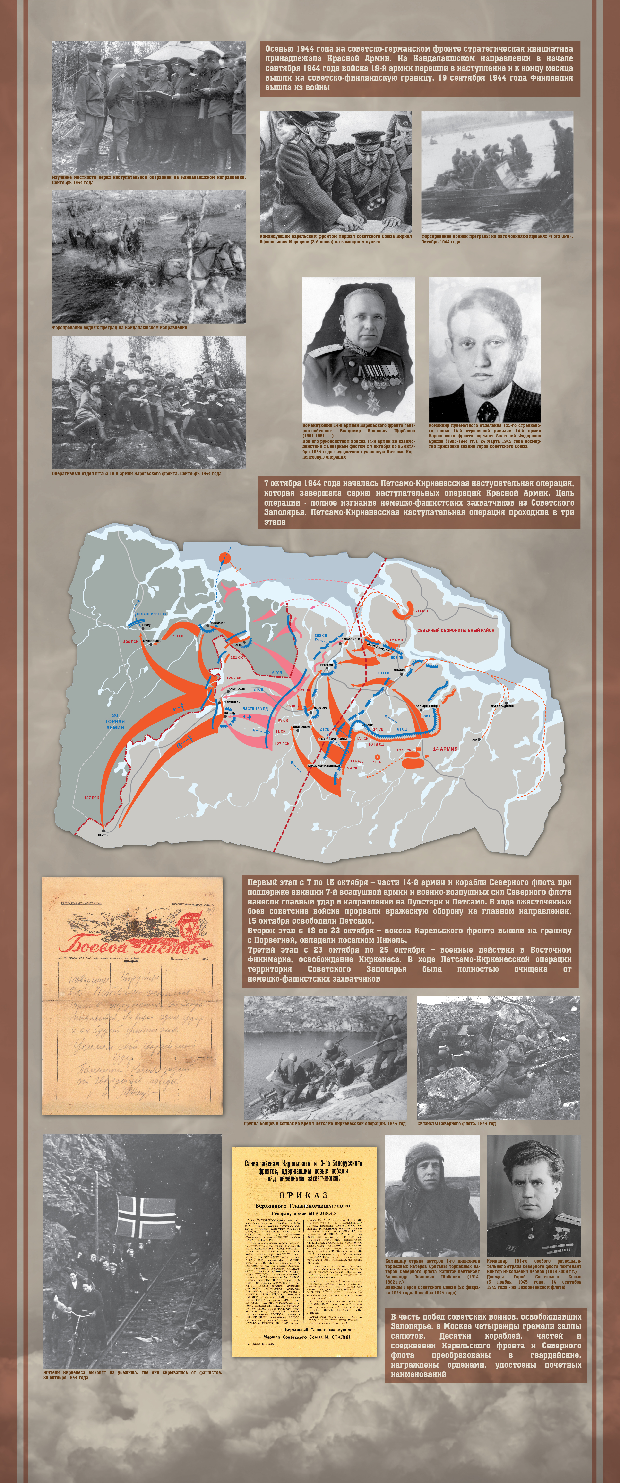 Советское командование организовало оборону Заполярья на суше и море. Войска Северного и Карельского фронтов, Северного флота и Беломорской военной флотилии в течение трех лет – с июня 1941 года по сентябрь 1944 года – героически противостояли немецким и финским захватчикам на Кольском полуострове, в Северной Карелии, на Баренцевом, Белом и Карском морях.