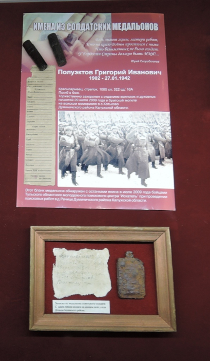 В здании-шлеме продолжает свою работу выставка, посвященная 20-летию Тульского областного молодежного поискового центра «Искатель». Фотолетопись поискового движения Тульской области дополняют подлинные предметы, обнаруженные в ходе полевых работ. Большой удачей для поисковиков считается находка легендарного солдатского медальона, который играет ключевую роль в установлении личности погибшего бойца. Медальон был введен Приказом Революционного военного совета (РВС) в 1925 году как документ, удостоверяющий личность. Он практически не отличался от медальона времен Первой мировой войны, который делали из жести в виде плоской коробочки с размерами 50х33х4 мм и носили на груди. В медальоне находился специальный бланк (вкладыш), изготовленный типографским способом на пергаментной бумаге для защиты от порчи при ношении. Во вкладыше содержались необходимые сведения о бойце: фамилия, имя, отчество, место и дата рождения, занимаемая должность. Солдатские медальоны выдавались всем зачисленным на военную службу, независимо от рода войск.