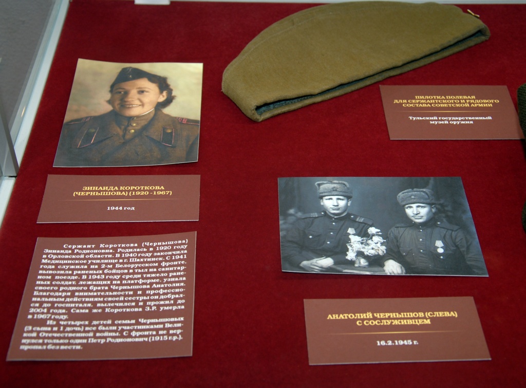 Одним из них является летняя гимнастерка для рядового и сержантского состава Рабоче-Крестьянской Красной Армии образца 1943 года. В 2012 году ее передал в музей ветеран боевых действий в Северо-Кавказском регионе, кавалер двух орденов Мужества житель г. Тулы Андрей Викторович Коротков. Гимнастерка принадлежала его маме – Зинаиде Родионовне Коротковой (в девичестве – Чернышовой), служившей с 1941 года на санитарном поезде и спасавшей раненых бойцов 2-го Белорусского фронта. Однажды среди них оказался и ее родной брат Анатолий, которого она в 1943 году случайно увидела в числе многих лежащих на платформе и ждавших отправления в тыл тяжело раненных советских солдат.