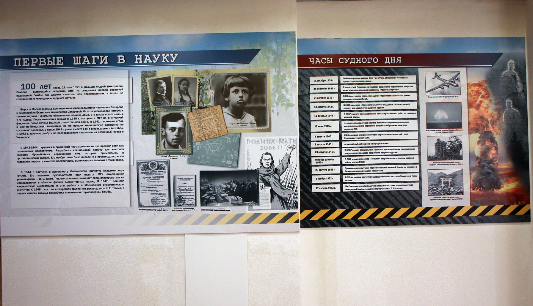 Выставка раскрывает огромный вклад А.Д. Сахарова в обеспечении безопасности нашей страны. Посетители узнают об исторической эпохе, повлиявшей на становление великого ученого и формирование его пацифистских взглядов, о роли и возможности применения «мирного» атома на благо человечества, а также о разработке и производстве ядерного вооружения в России в середине XX в.