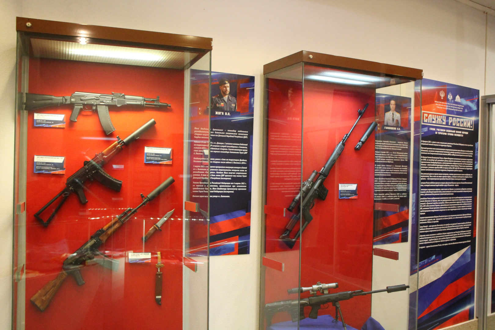 Экспозиция пополнилась более чем 20 новыми экспонатами, среди которых - станковый гранатомет АГС-17, автомат малогабаритный ОЦ-14 «Тисс», крупнокалиберный пулемет «Корд» и элементы снаряжения (от приборов ночного видения до крюка-кошки) военнослужащих и специалистов.