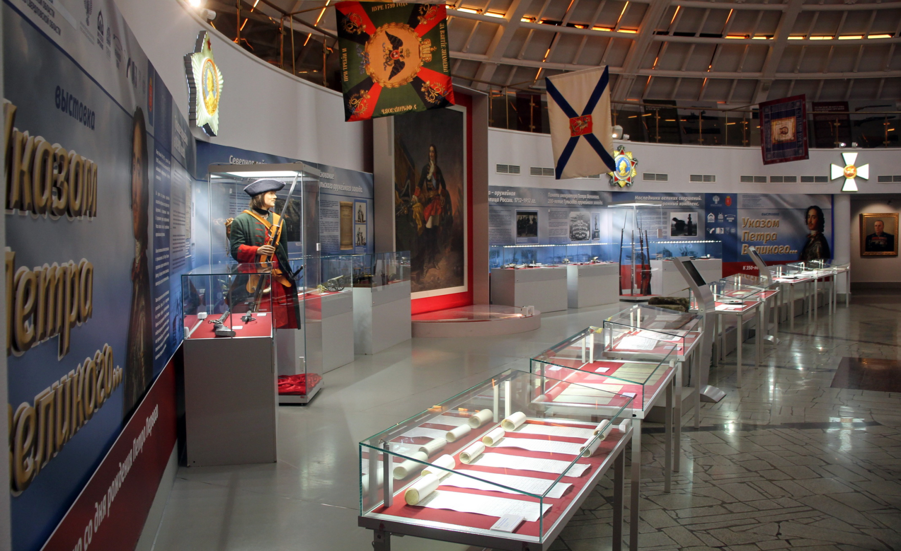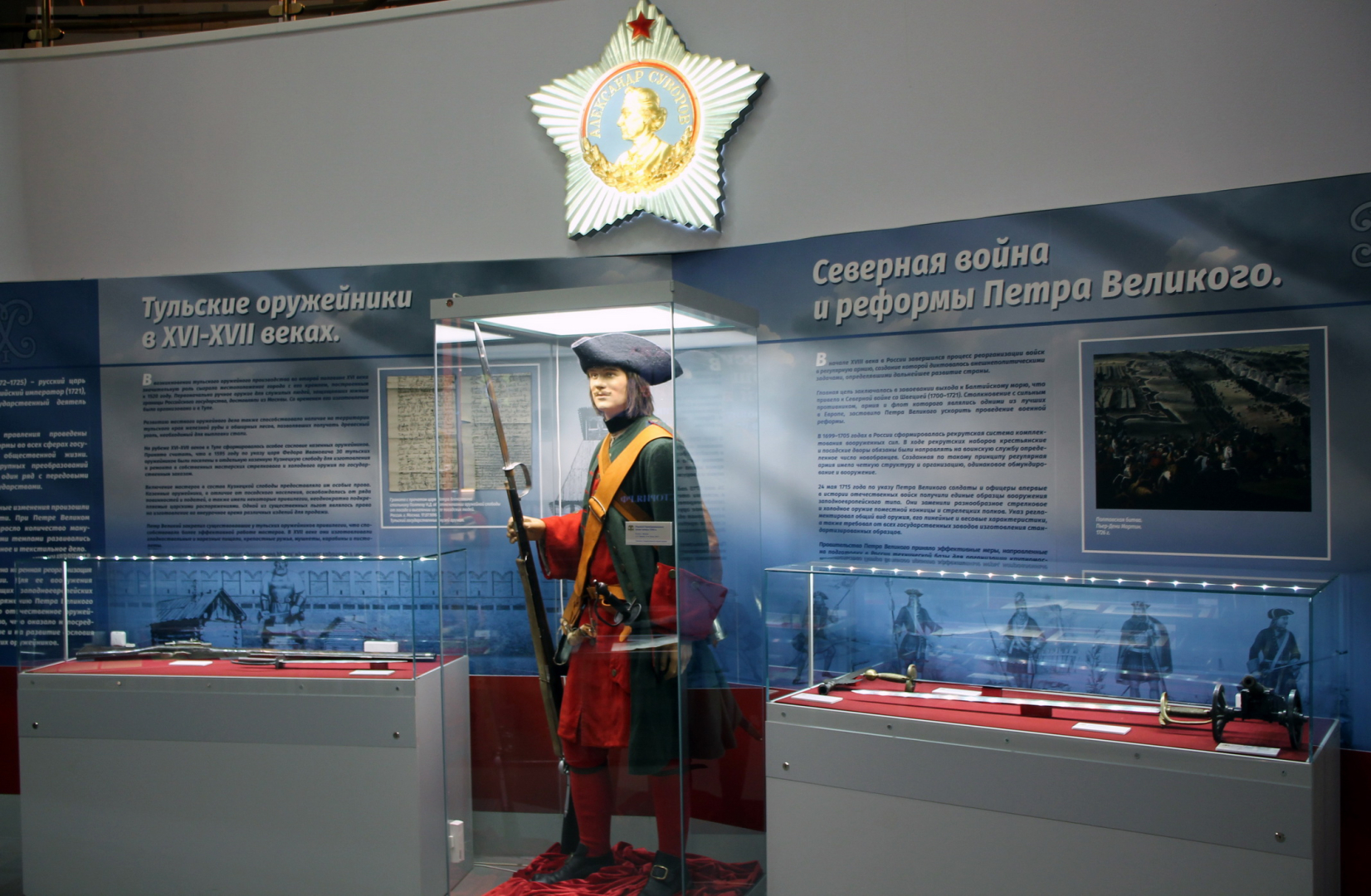 Центральное место на выставке занимает портрет Петра Великого в мундире офицера Преображенского полка, выполненный в начале ХХ века художником Василием Фомичем Гильбертом, из фондов Тульского государственного музея оружия. Масштабное полотно является копией картины батального живописца Николая Дмитриевича Дмитриева-Оренбургского. Тульский государственный музей оружия представляет также грамоты Петра Первого местным оружейникам, памятную пластину с оттиском правой ладони императора, а также образцы армейского оружия XVIII – начала XX века с заводскими клеймами: шпаги и сабли, пистолеты и ружья, винтовки и револьверы. Особое место на выставке займет музейная скульптура «Рядовой Преображенского полка начала XVIII века» как символ российской регулярной армии, созданной Петром Первым.