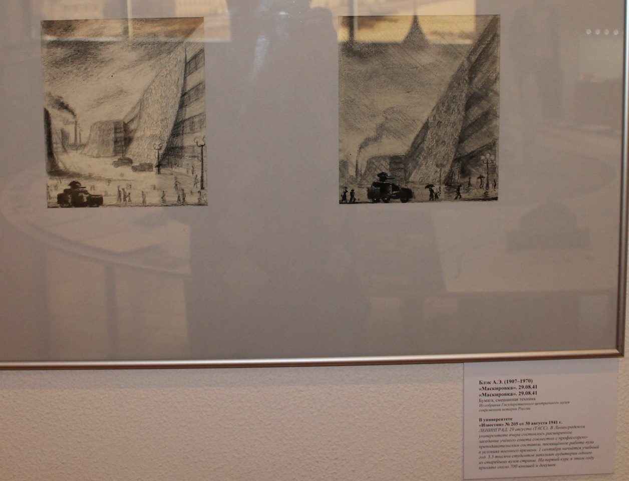 Художник-график Александр Эдуардович Блэк (1907-1970 гг.), коренной ленинградец, как никто другой в годы Великой Отечественной войны прочувствовал тему подвига родного города – Ленинграда, его жителей и передал в своих работах. «Объявление войны», «Воздушное заграждение», «Тревога», «Подбитый самолет» и другие работы, выполненные на бумаге в смешанной технике (карандаш, акварель, тушь, перо, гуашь), не оставят равнодушными зрителей.