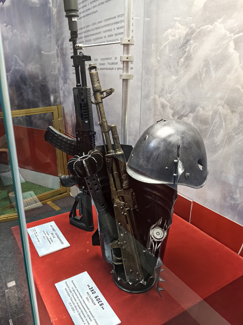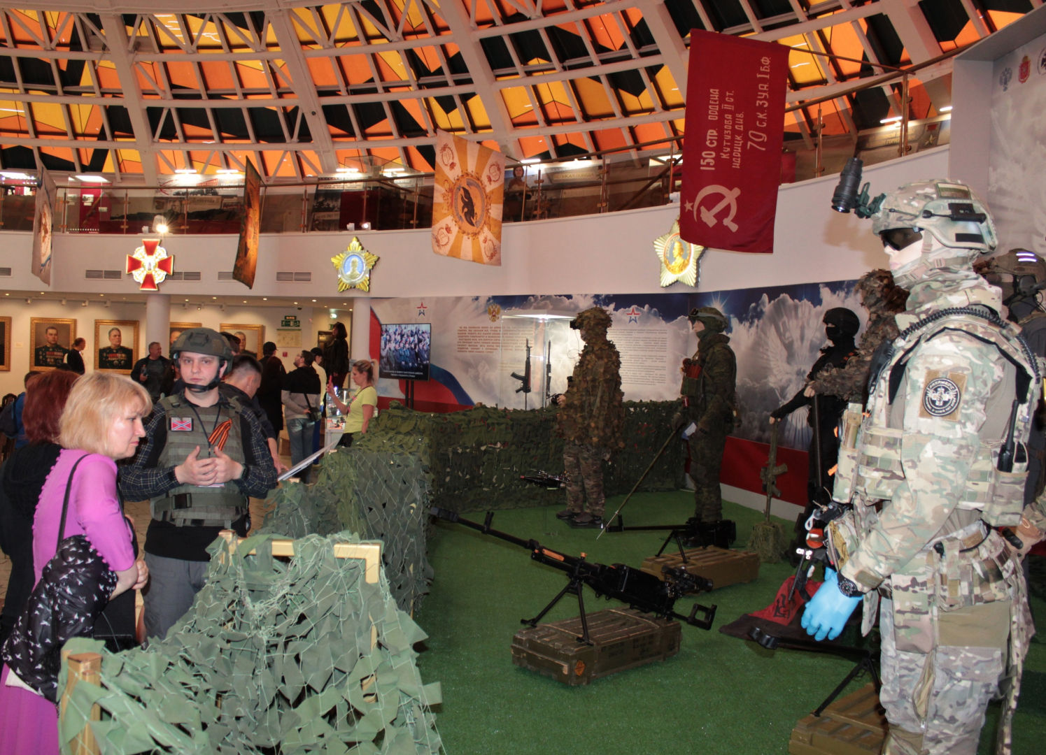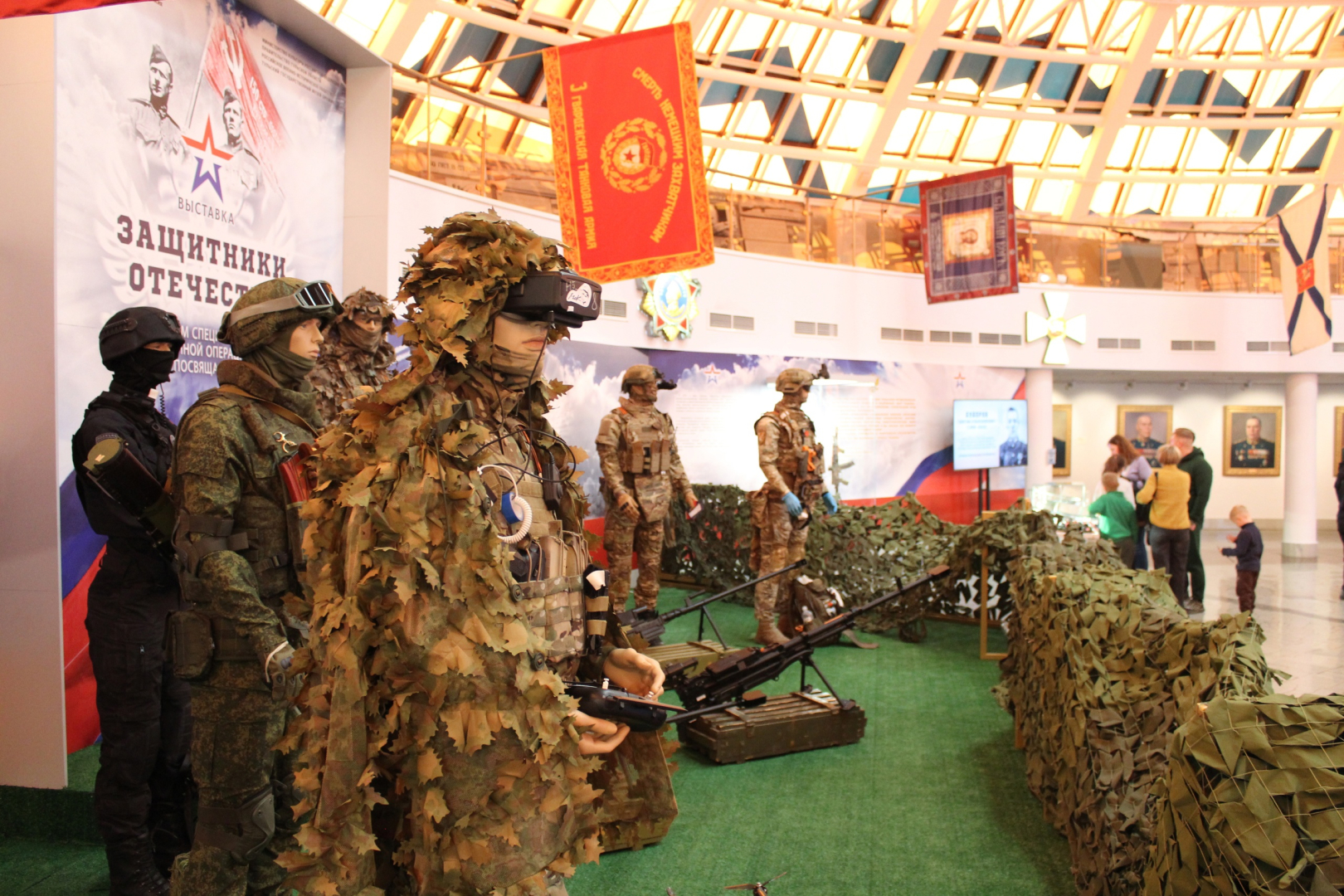 Выставка включает в себя также витринный комплекс «Защитники Отечества», где представлены 9 комплектов снаряжения военнослужащих российской армии и сотрудников специальных подразделений.