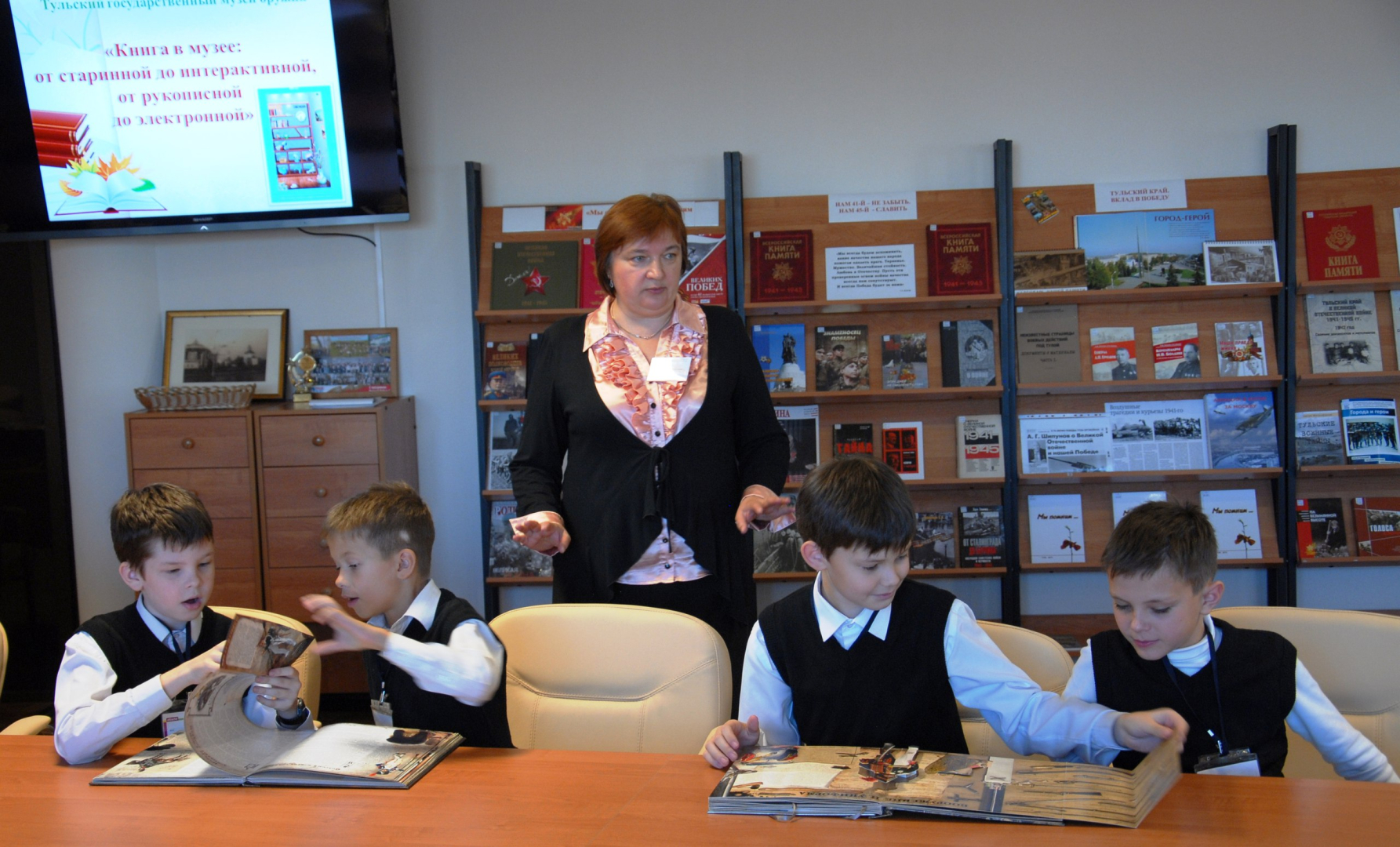 21 и 23 октября в музее прошли уроки «Книга в музее: от старинной до интерактивной, от рукописной до электронной» для учащихся школы № 29 им. Героя Советского Союза О.П. Матвеева. В теплой и уютной атмосфере читального зала четвероклассники знакомились с редкими и ценными изданиями библиотечного фонда Тульского музея оружия, по-детски восторженно реагируя на высокохудожественное оформление книг, загадочные владельческие знаки и трепетно, с интересом изучая старопечатные, интерактивные и мультимедийные издания.