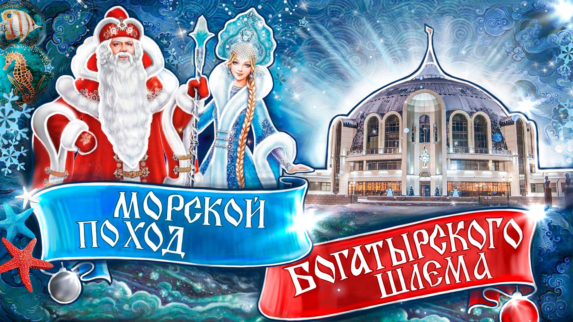 Магическая сила Богатырского Шлема уже переносила зрителей к далеким звездным мирам, помогала совершить путешествие сквозь время, открыть множество тайн истории и преодолеть все преграды на пути к празднику. В Новом 2024 году мы приглашаем команду смелых и отважных юных друзей музея вместе с Дедом Морозом, Снегурочкой и сказочной птицей Гамаюн отправиться в захватывающее путешествие в подводное царство.