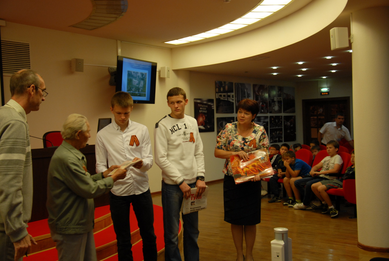 Накануне трагического дня начала Великой Отечественной войны, вошедшего в историю как День Памяти и скорби, в музее оружия состоялась встреча с ветеранами «Потомки, память сохраните!». Память о своих предках – самое ценное, что хранится в наших сердцах. Эта мысль стала лейтмотивом встречи поколений. В трогательной атмосфере ребята благодарили участников войны и тружеников тыла за мирное небо над головой: «Спасибо вам, что мы войны не знали!». С трепетом в душе учащиеся приняли в школьные музеи бесценные дары из рук ветерана Великой Отечественной войны, участника боев за город Брест Е.Т. Шалашникова - капсулы со священной землей, привезенной из героической Брестской крепости, и наградные документы на туляков – участников Великой Отечественной войны.