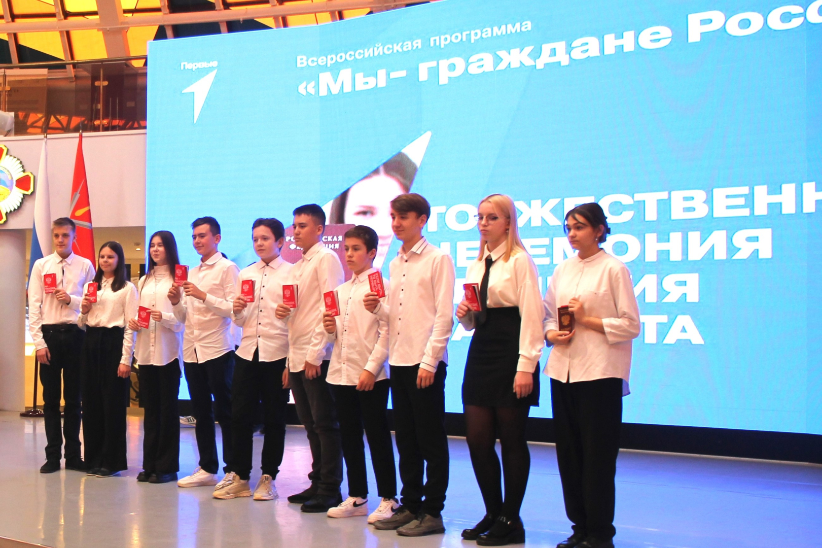 В Зале Славы российского оружия главный документ гражданина России получили 69 молодых жителей региона, имеющих особые заслуги в учебе, спорте, творчестве, общественной деятельности.