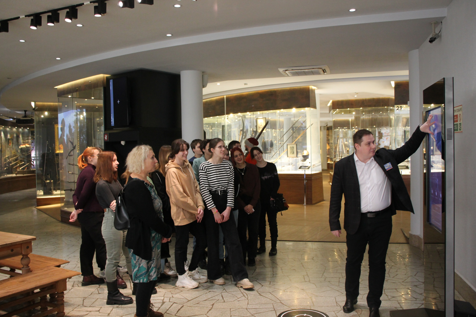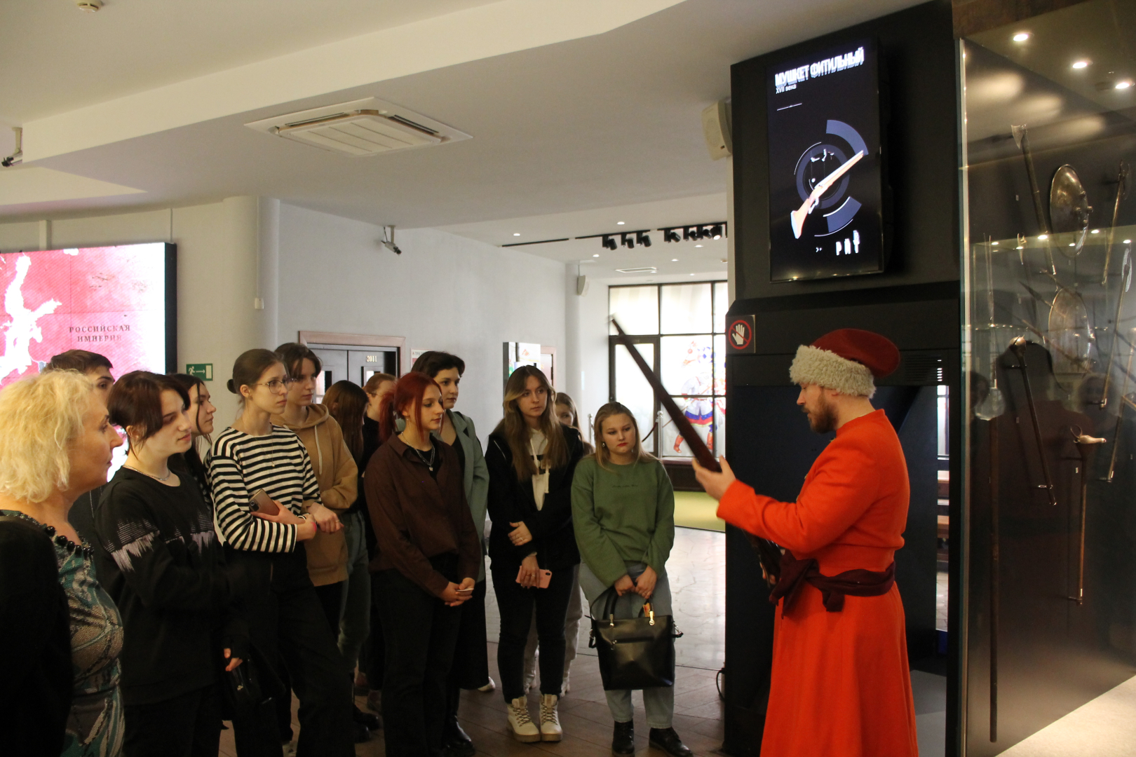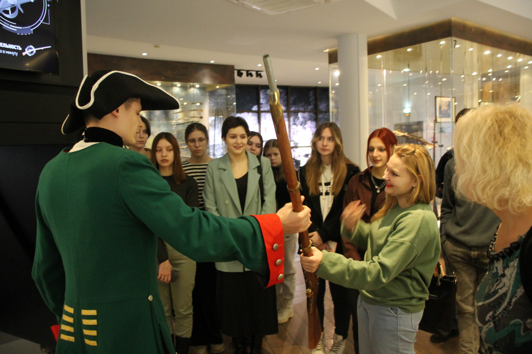 На костюмированных театрализованных интерактивных экскурсиях по постоянной экспозиции и выставкам музея студенты заинтересованно знакомились с легендарной историей оружейного производства Тулы и России.