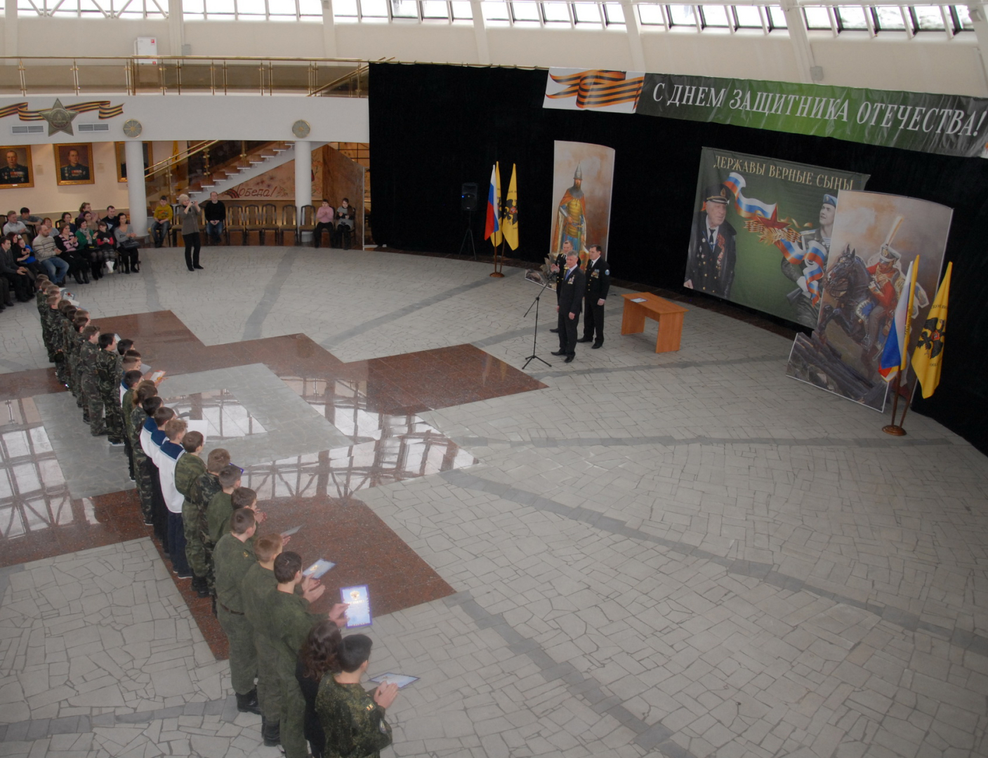 22 февраля, накануне Дня защитника Отечества, в музее оружия состоялось торжественное построение воспитанников военно-патриотического клуба «Тайфун». Юных патриотов приветствовали председатель региональной общественной организации «Тульское морское собрание», капитан I ранга В.Н. Лапшов и председатель совета старшин и матросов регионального отделения Всероссийской общественной организации морских пехотинцев «Тайфун» К.В. Дудкин. В торжественном зале музея звучали поздравления и добрые напутствия будущим защитникам Отечества.
