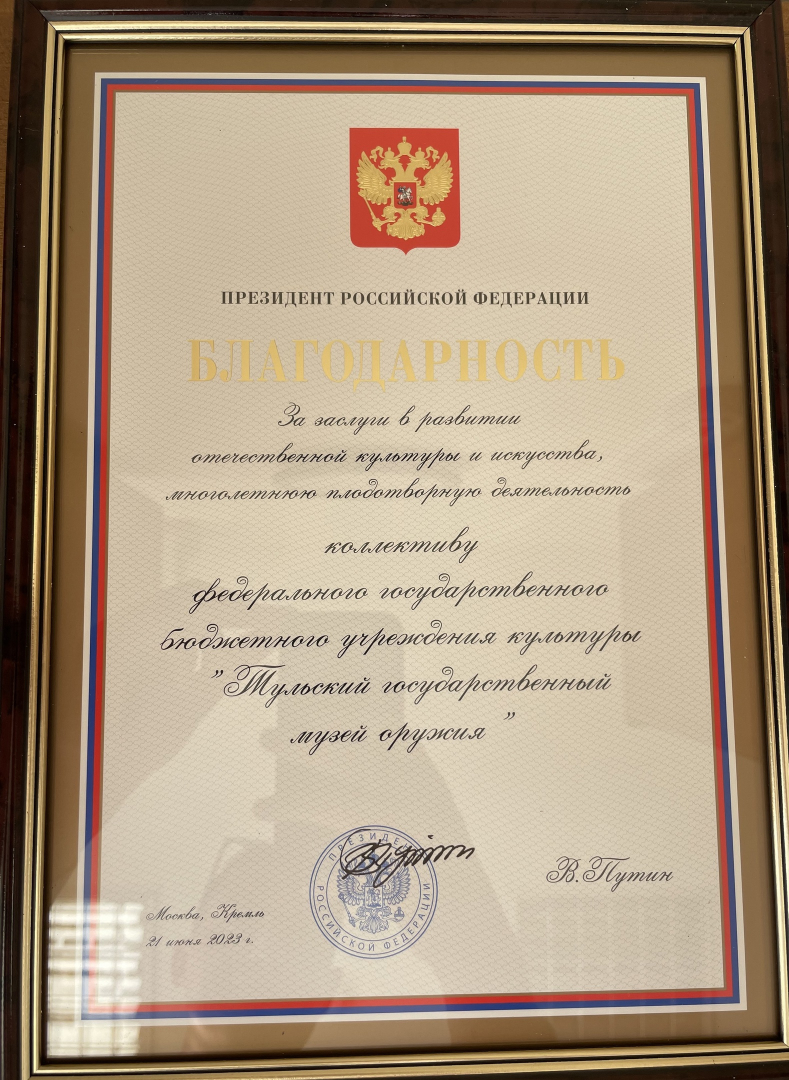 В адрес Тульского государственного музея оружия поступили поздравление и Благодарность Президента Российской Федерации Владимира Владимировича Путина.