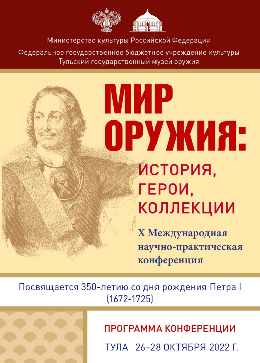 26-28 октября 2022 года в Тульском государственном музее оружия состоится Х Международная научно-практическая конференция «Мир оружия: история, герои, коллекции», посвященная 350-летию со дня рождения Петра I Великого (1672-1725).
